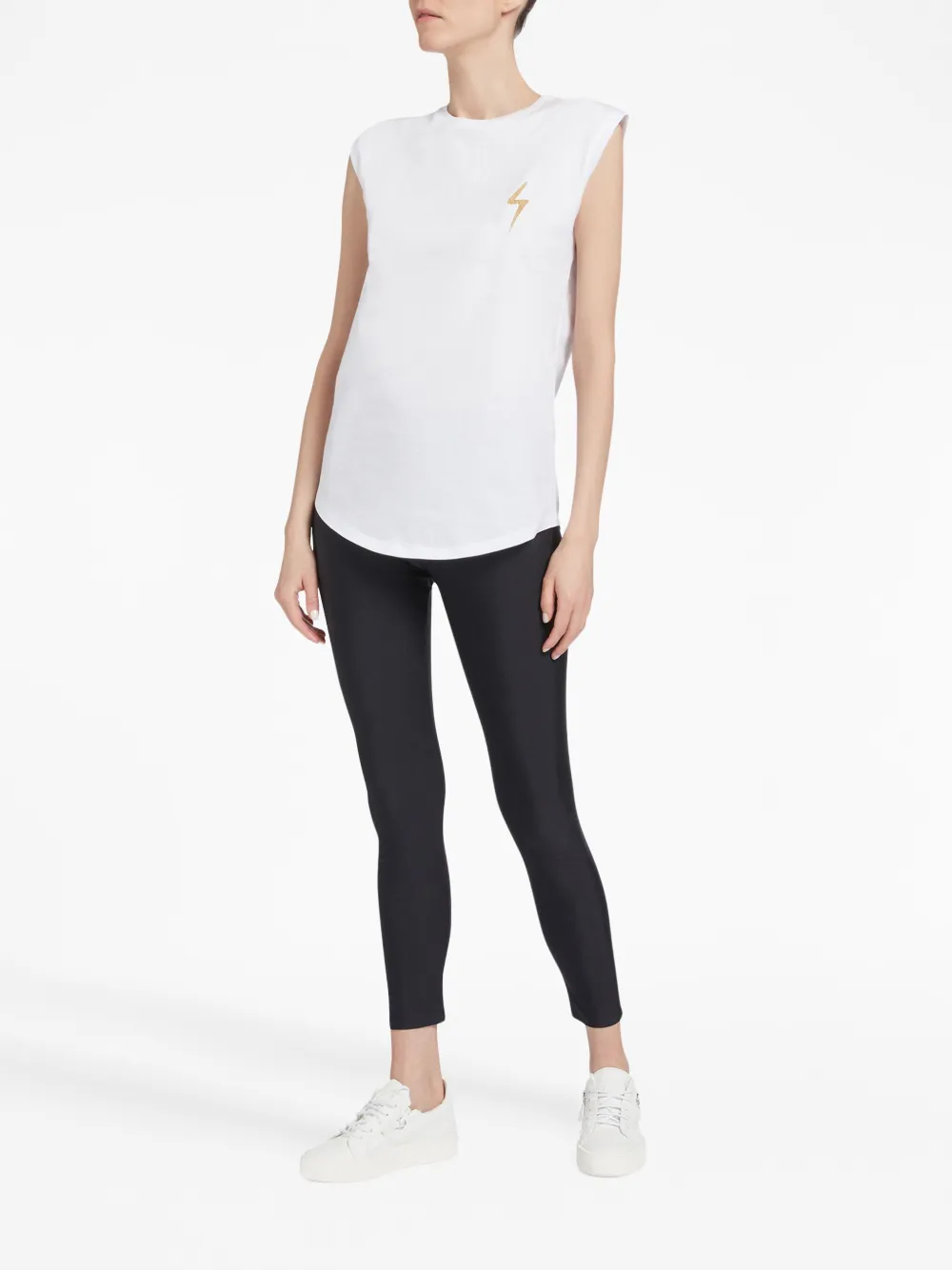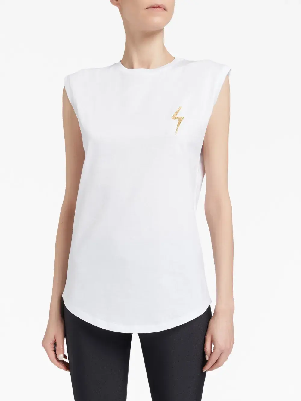 Белый, горчично-желтый, хлопок, вышитый логотип на груди, вышитый логотип сзади, круглый вырез, без рукавов и закругленный подол.