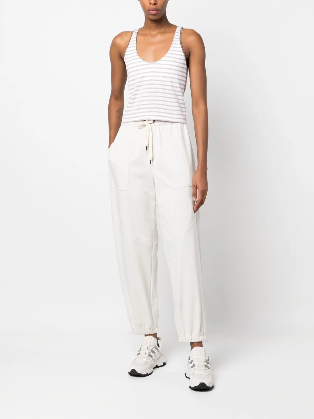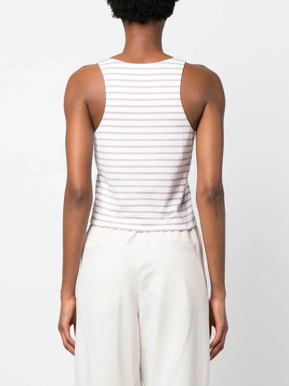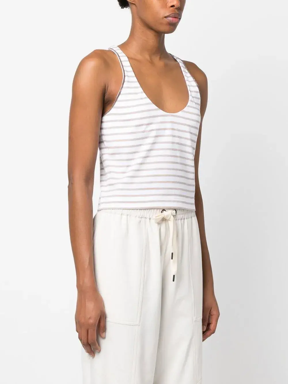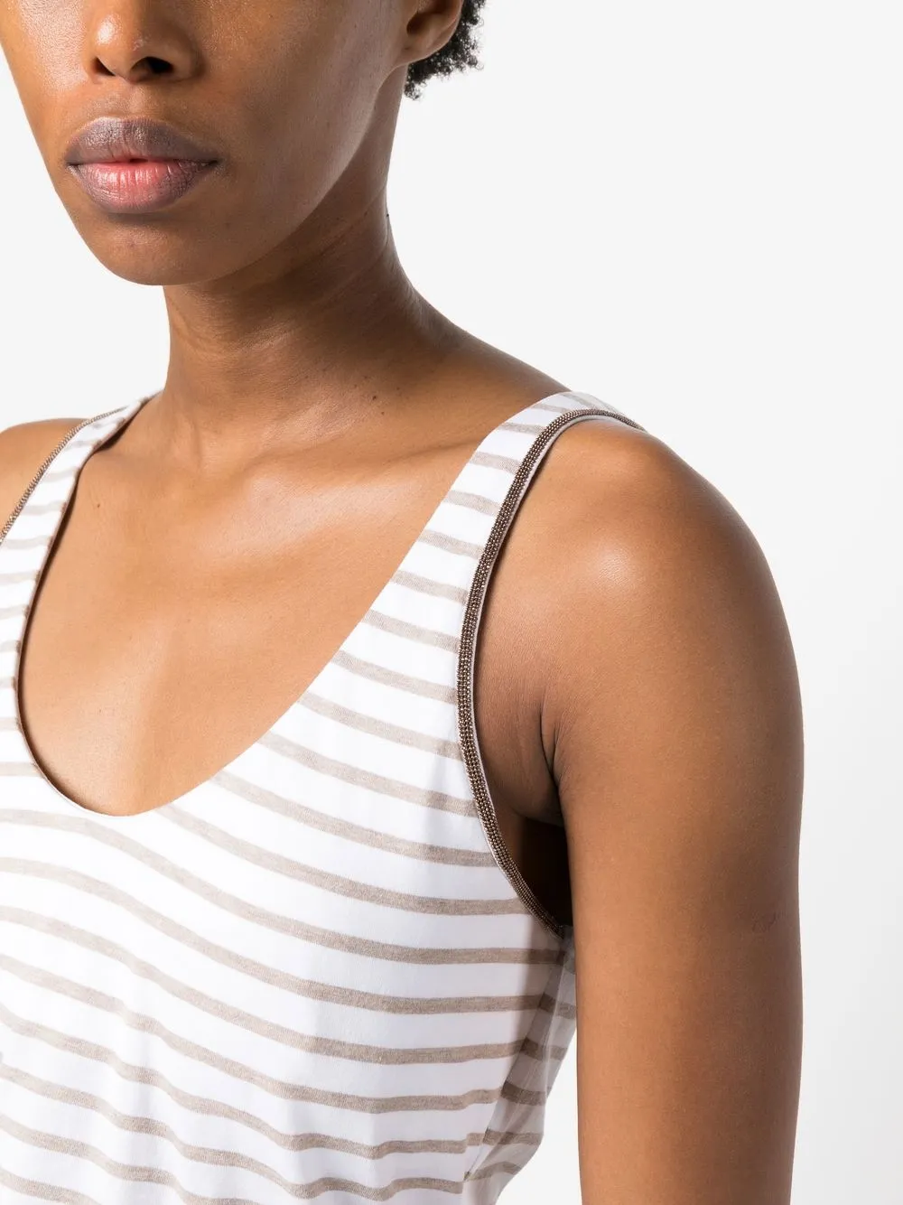 Расцветка Cloud White, смесовый хлопок, принт в горизонтальную полоску, ткань джерси, отделка бисером, U-образный вырез, без рукавов и прямой подол.