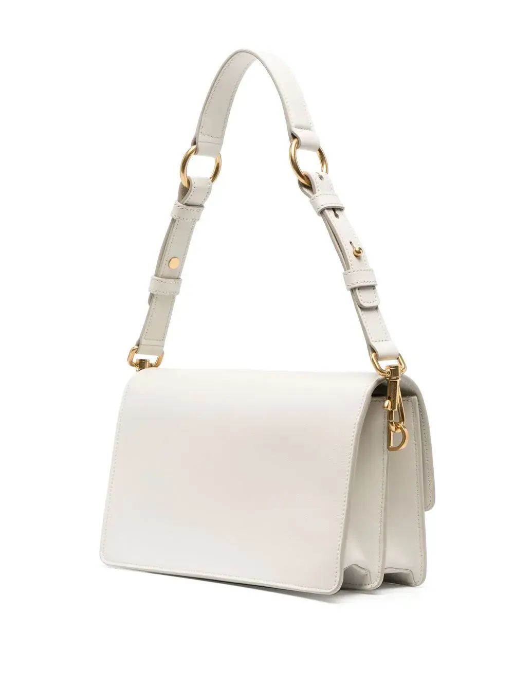 Белый, телячья кожа, золотистый металлический логотип, золотистые заклепки, съемный регулируемый ремень на плечо, откидной клапан на магните, несколько отделений, нашивка с логотипом внутри и внутренний прорезной карман.