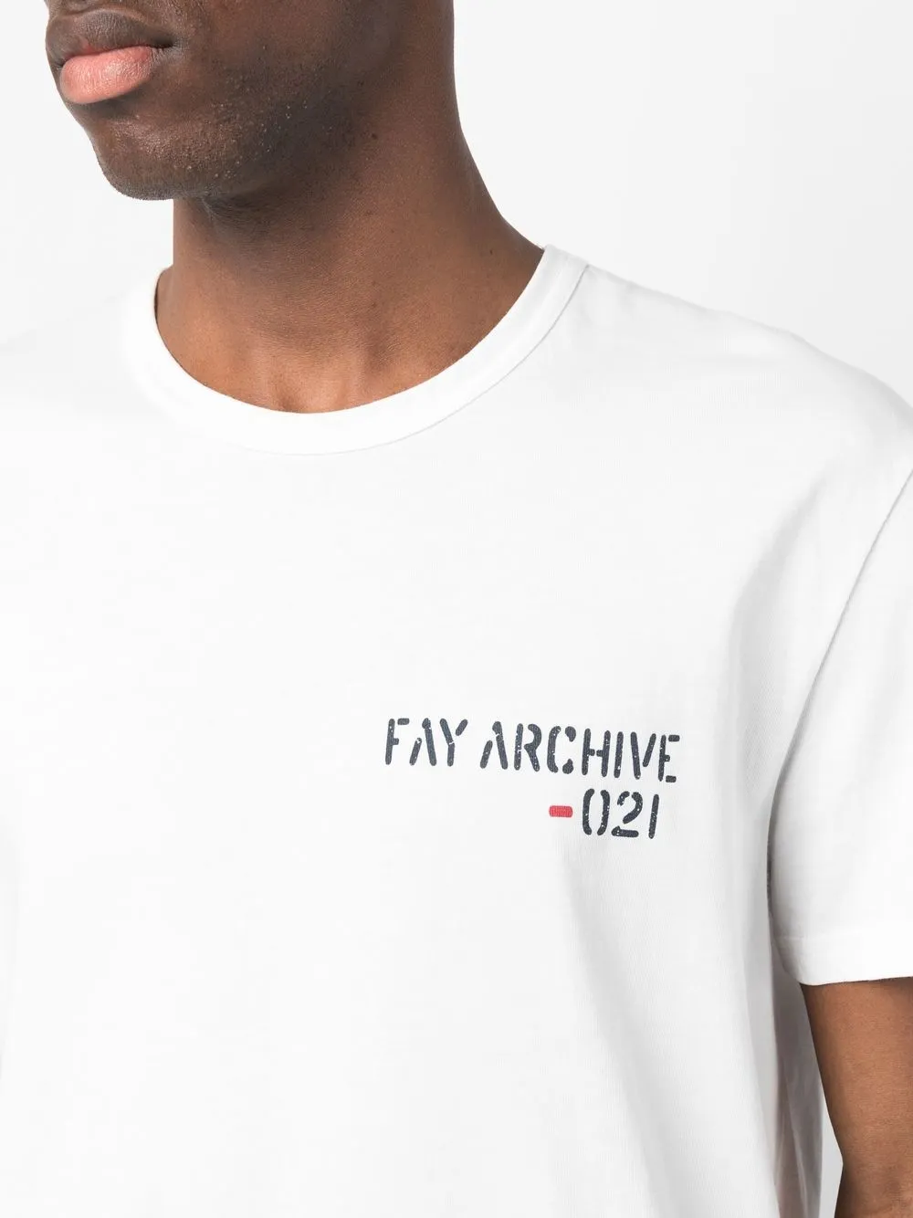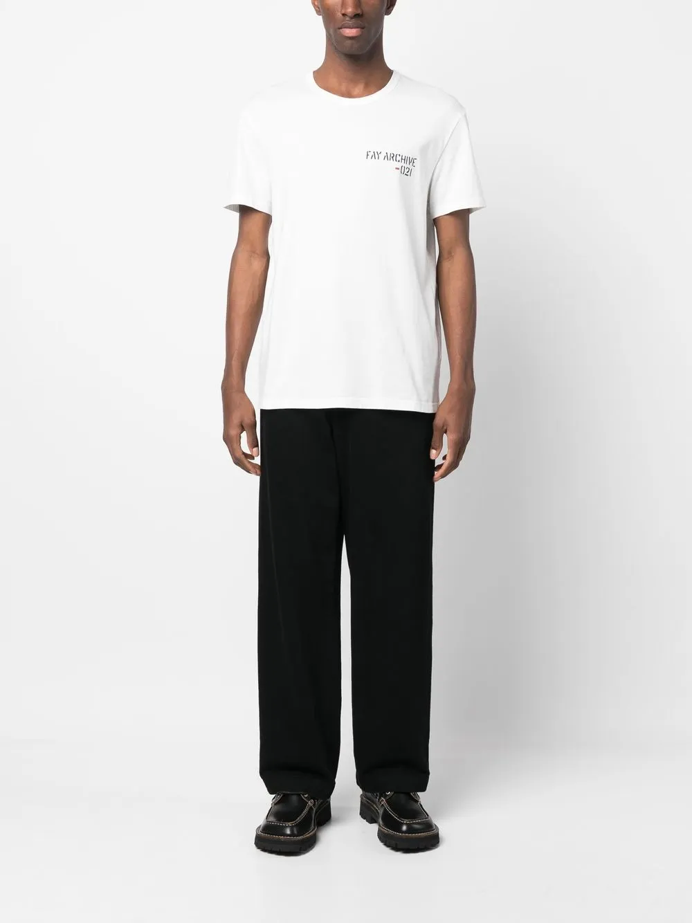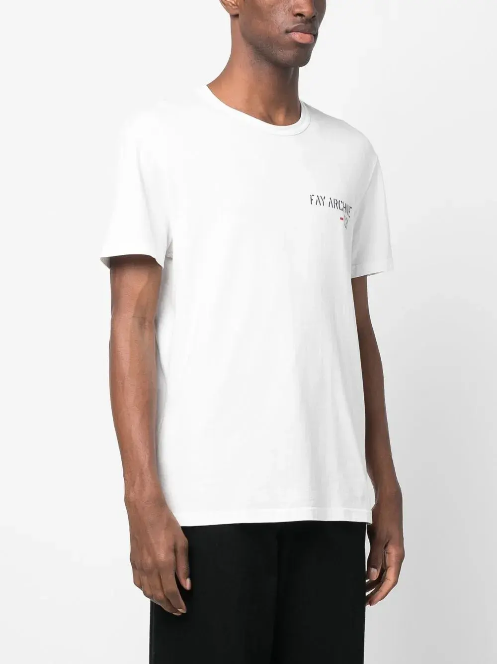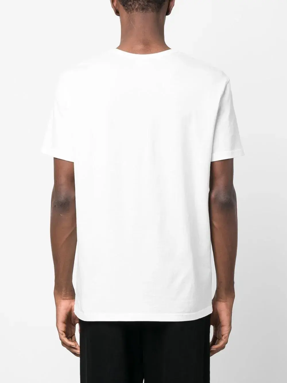 Белый, принт с логотипом на груди, круглый вырез, короткие рукава и прямой подол.