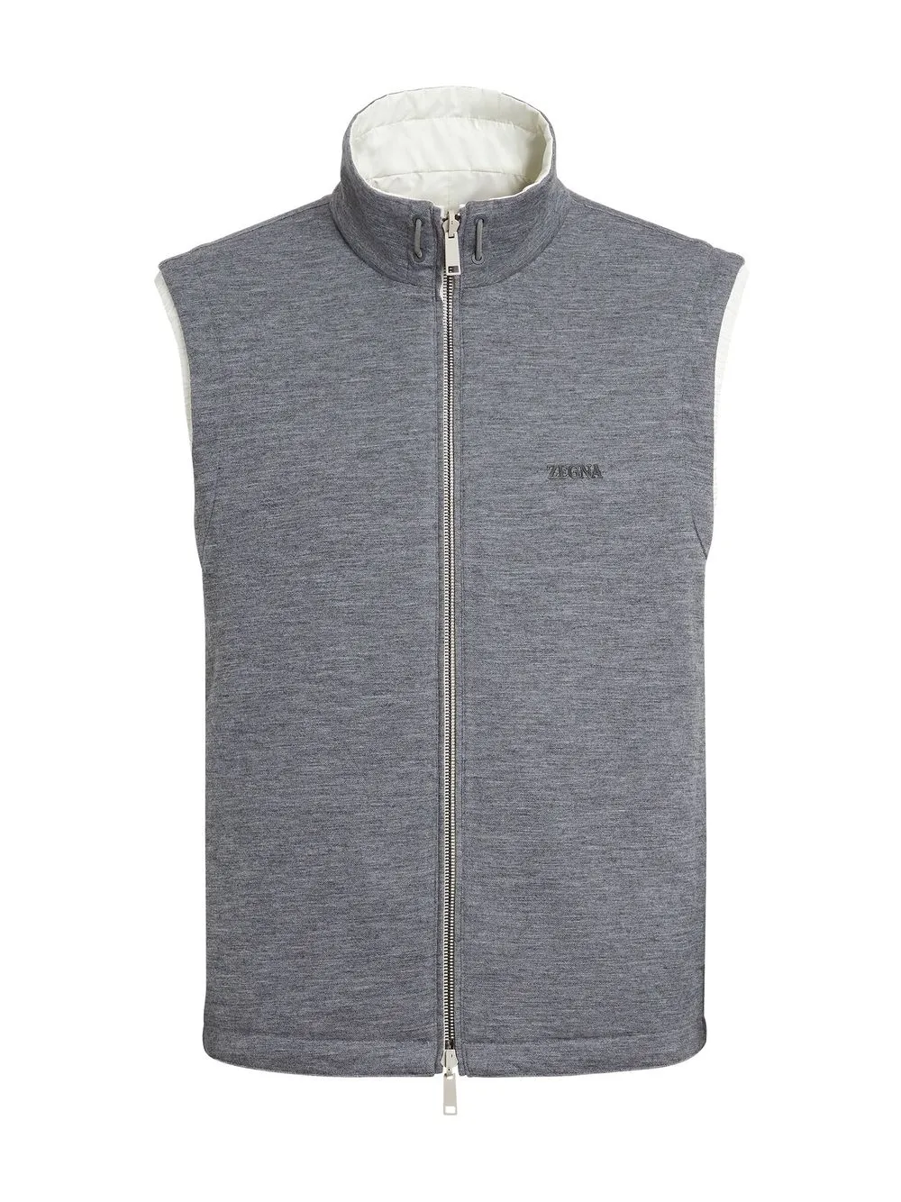 Белый, серый, двусторонний дизайн, логотип, эффект меланж, двусторонняя молния спереди, высокий воротник, воротник с кулиской, два кармана на молнии, без рукавов и прямой подол.