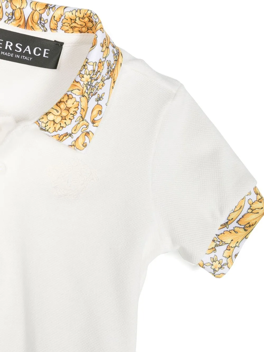Белый, золотистый, хлопок, знаковый принт Barocco, воротник поло, короткие рукава и прямой подол.