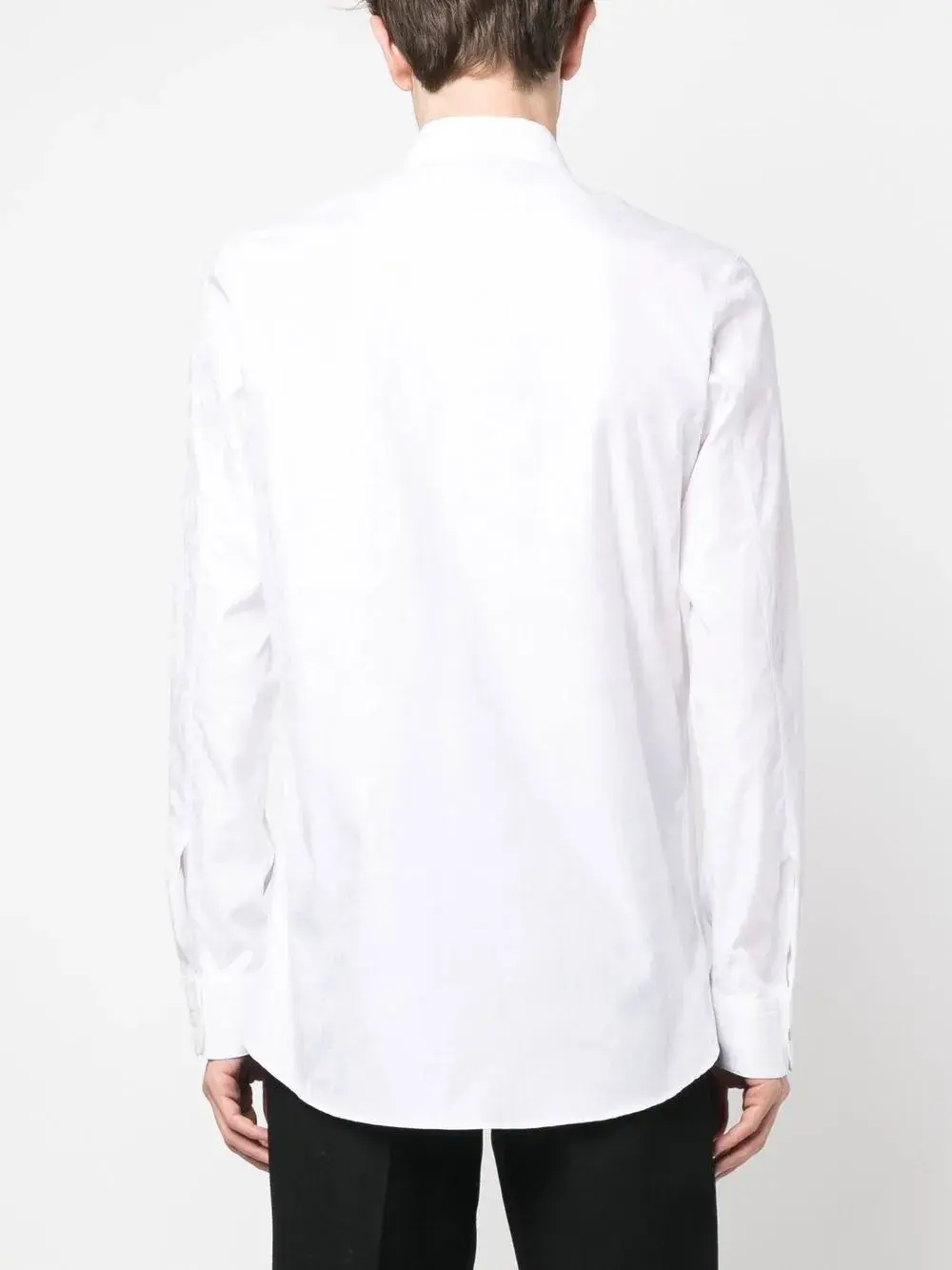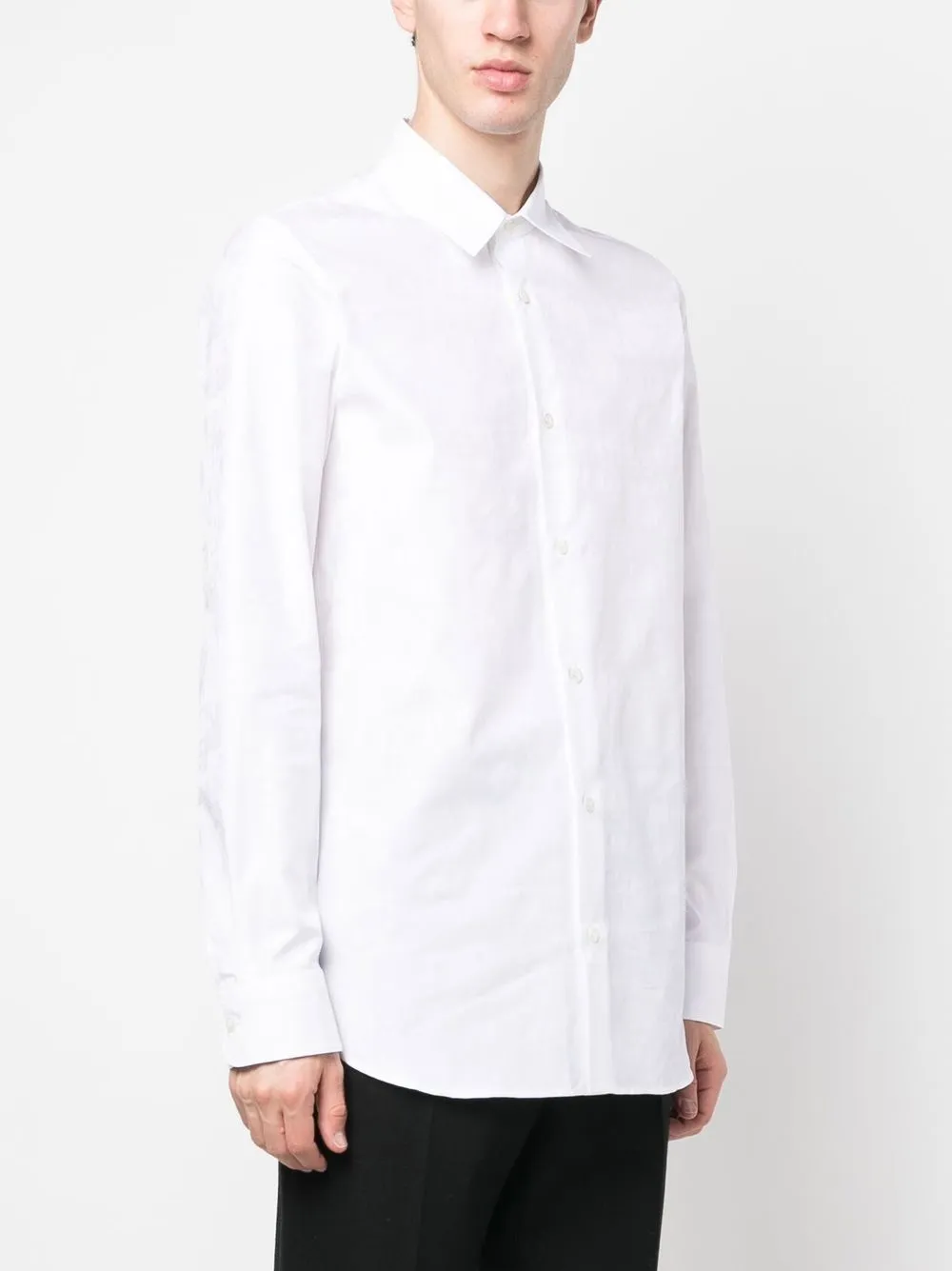 Белый, хлопок, сплошной принт с логотипом, классический воротник, застежка на пуговицах спереди, длинные рукава и манжеты на пуговицах.