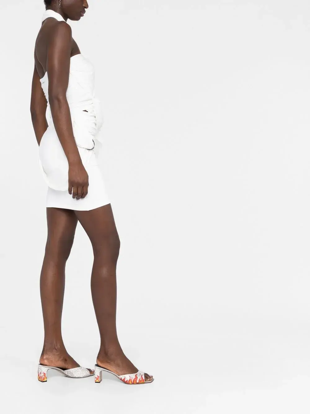Белый, эластичный материал, драпировка, длина до бедер и серебристая фурнитура.