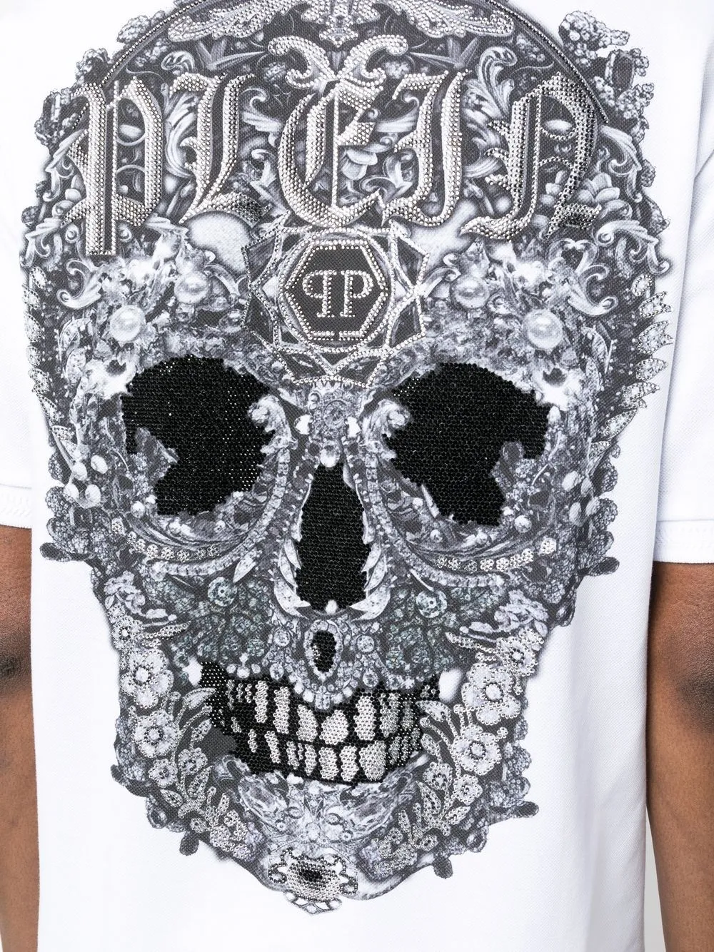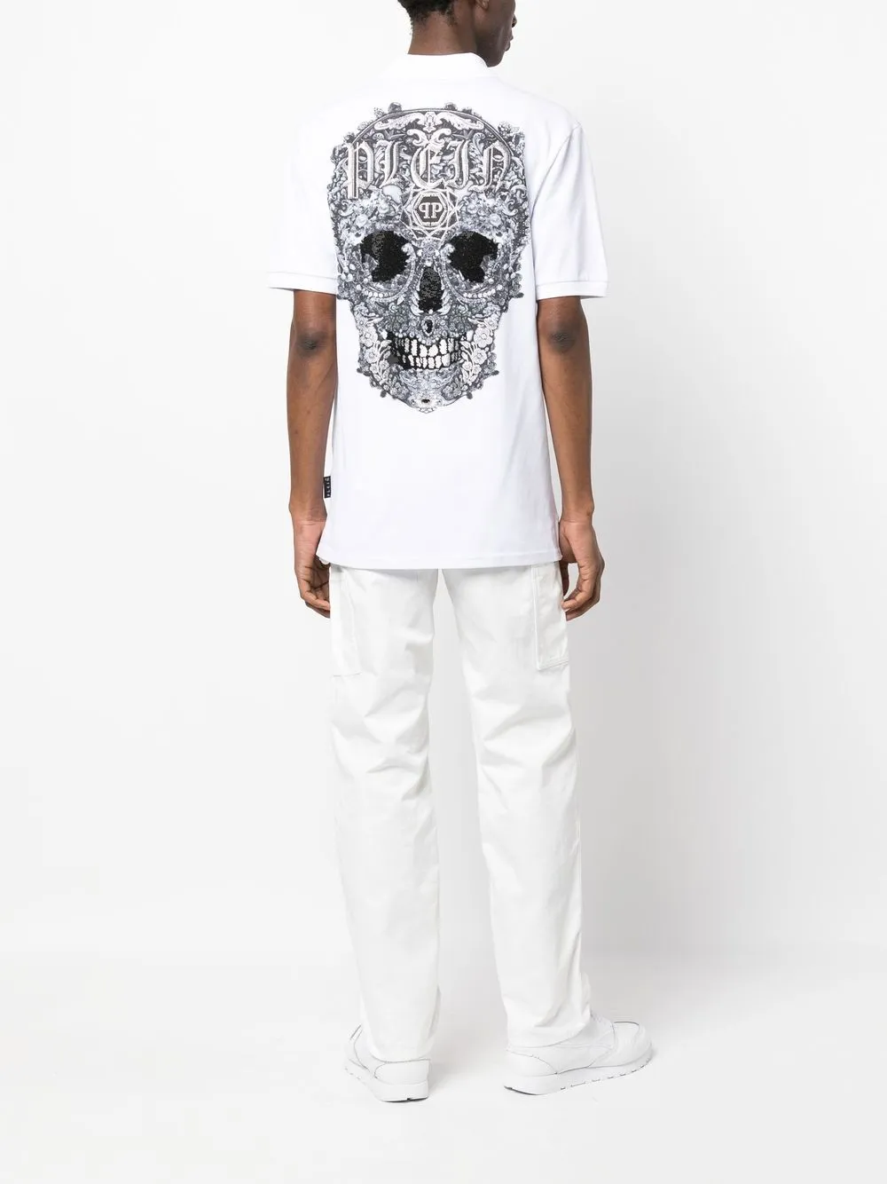 Белый/черный, принт с изображением черепа на тыльной стороне, украшения из горного хрусталя, нашивка с логотипом на груди, бирка с логотипом, короткая застежка на пуговицах спереди, воротник поло, короткие рукава и прямой подол.