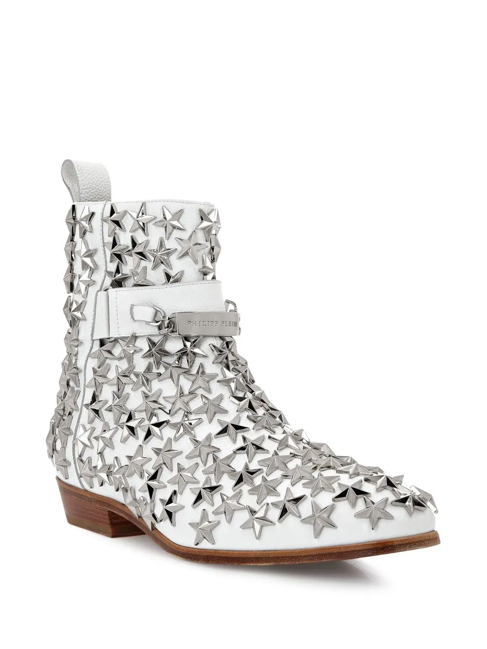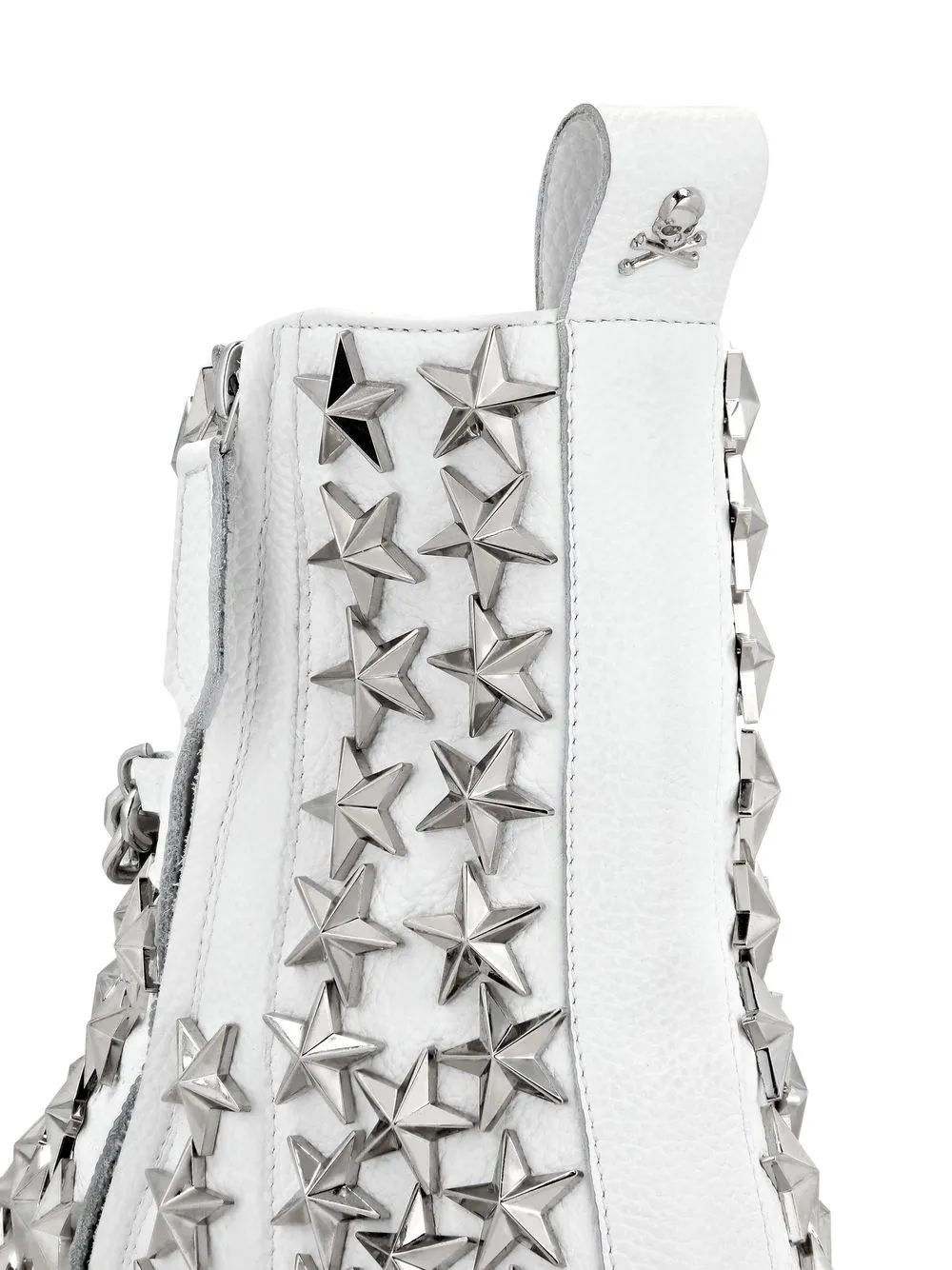 Белый, телячья кожа, серебристая фурнитура, заклепки в форме звезд, застежка на молнии сбоку, петля для подтягивания сзади, кожаная стелька с логотипом и кожаная подошва.
