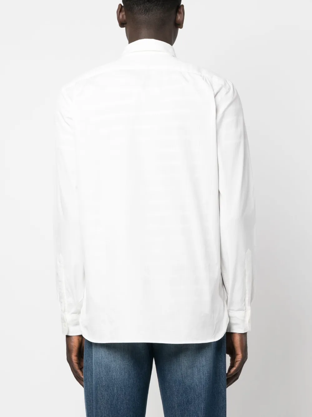 Белый, хлопок, классический воротник, застежка на пуговицах спереди, длинные рукава, манжеты на пуговицах и закругленный подол.