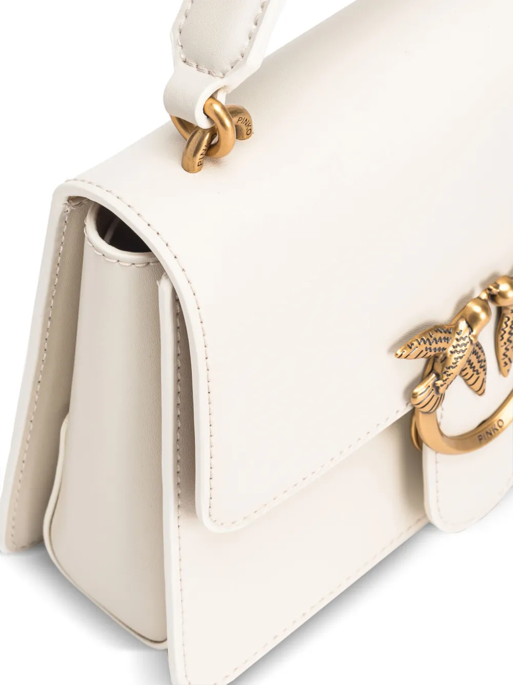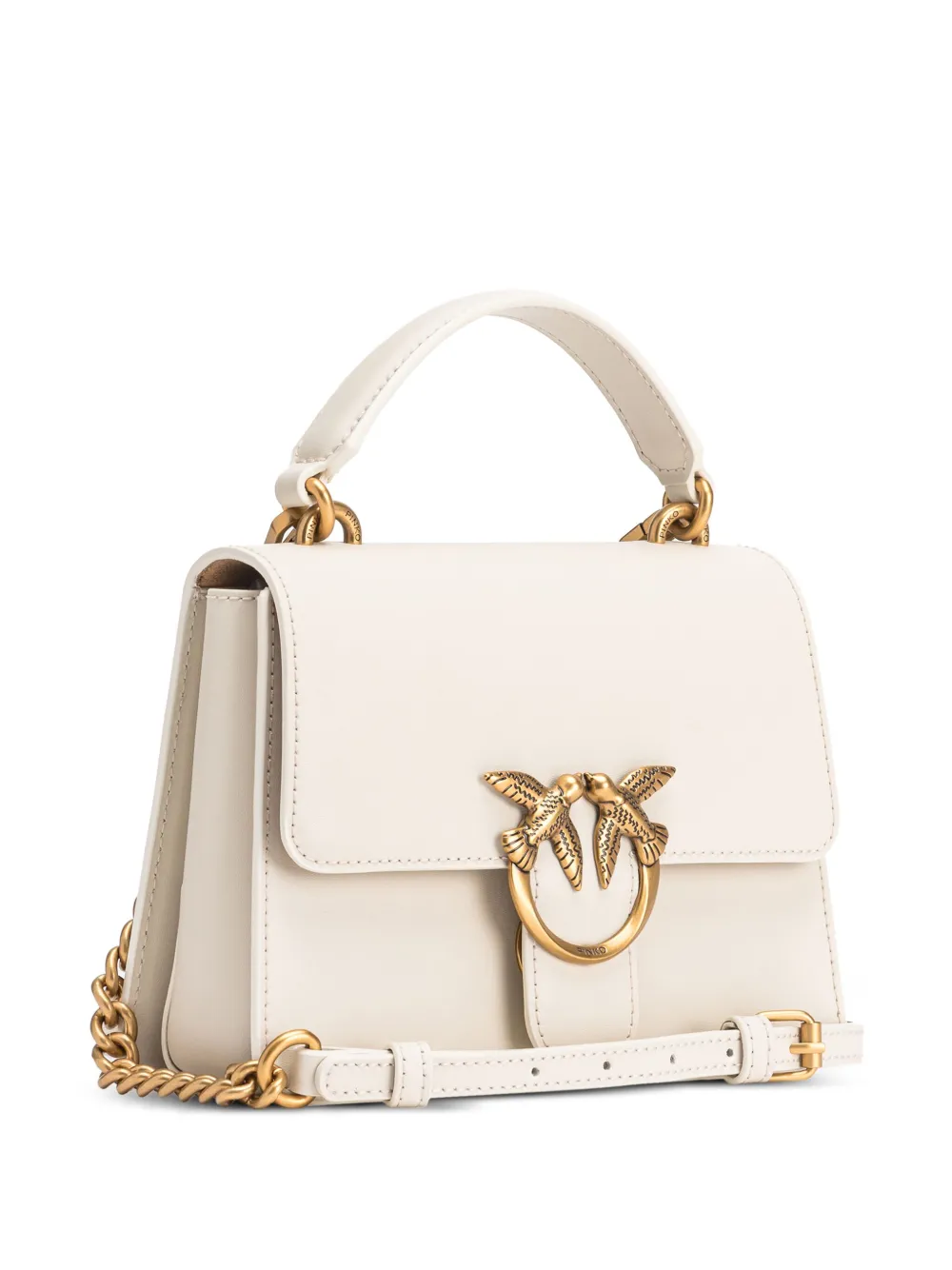 Белый, телячья кожа, ручка с плоским верхом, застежка с клапаном спереди, пряжка Love Birds и съемный регулируемый ремень на плечо.