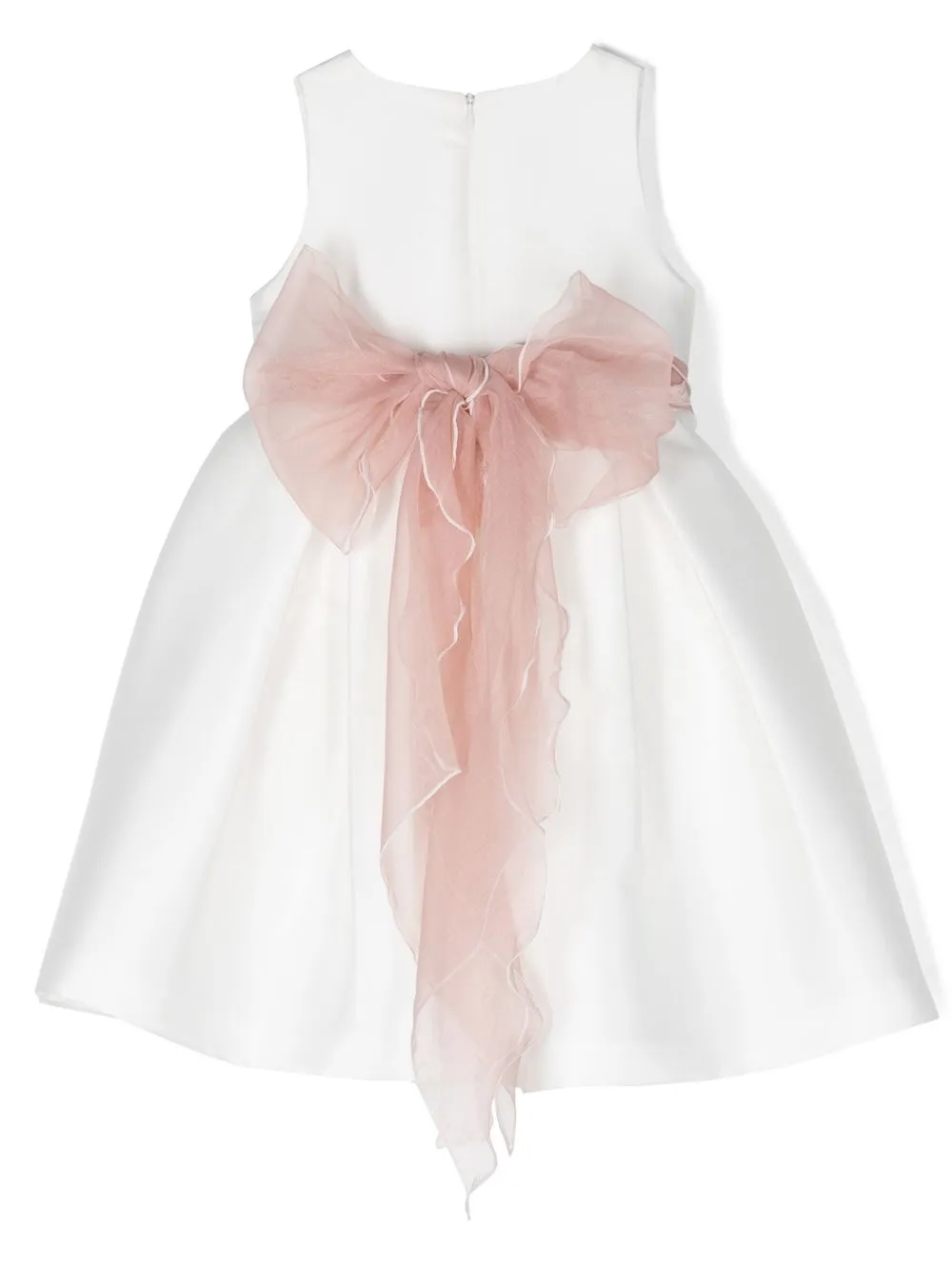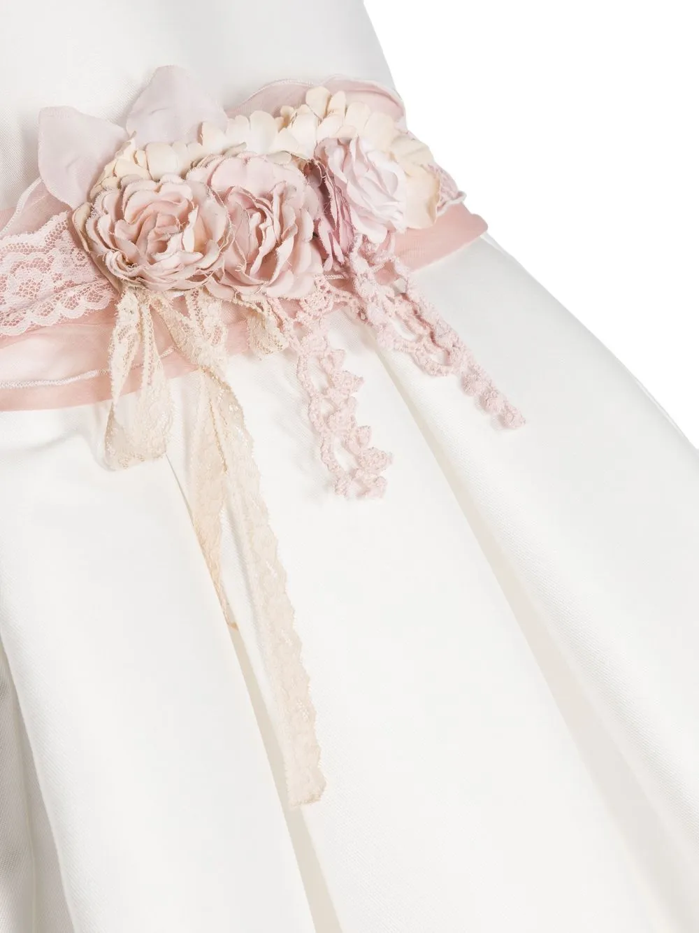 Белый, розовый, смесовый хлопок, кружевная отделка, цветочная деталь, круглый вырез, потайная застежка на молнии сзади, кулиска на талии и плиссированная юбка.