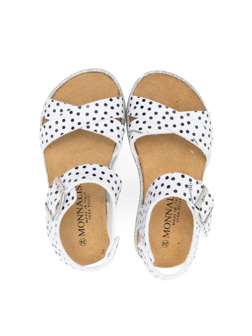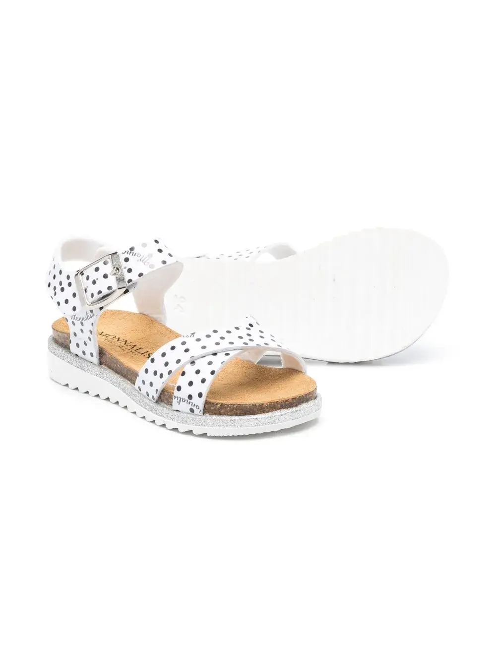 Черный/белый, телячья кожа, принт в горох, перекрестные ремешки, открытый носок, ремешок на щиколотке с пряжкой, формованная стелька и рифленая резиновая подошва.