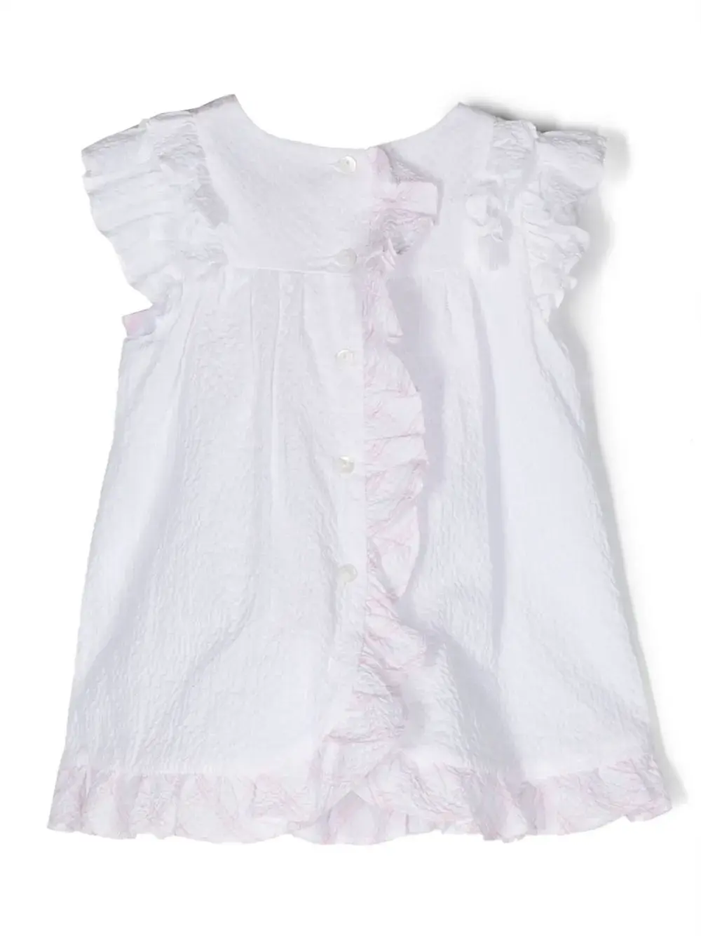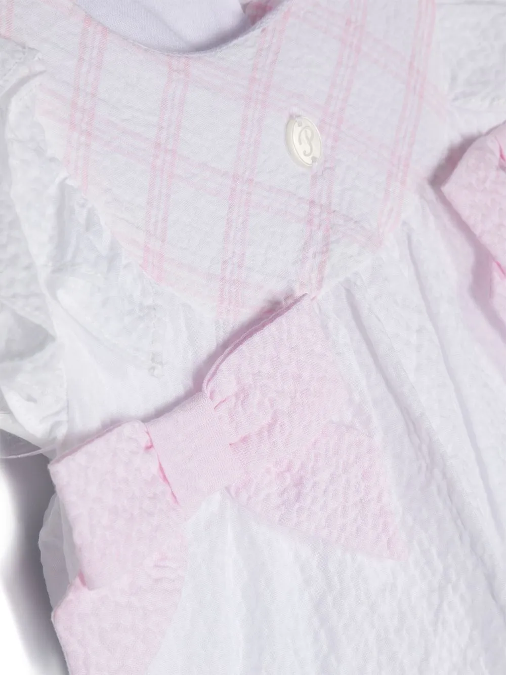 Белый, розовый, эластичный хлопок, сирсакер, принт в клетку, бант, вставки с оборками, подвеска с логотипом, подол с баской, застежка на пуговицы сзади, круглый вырез и без рукавов.