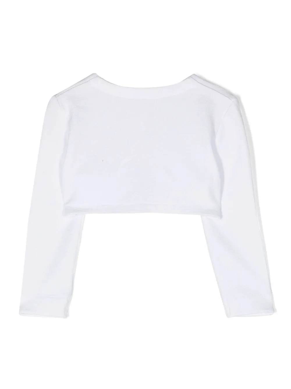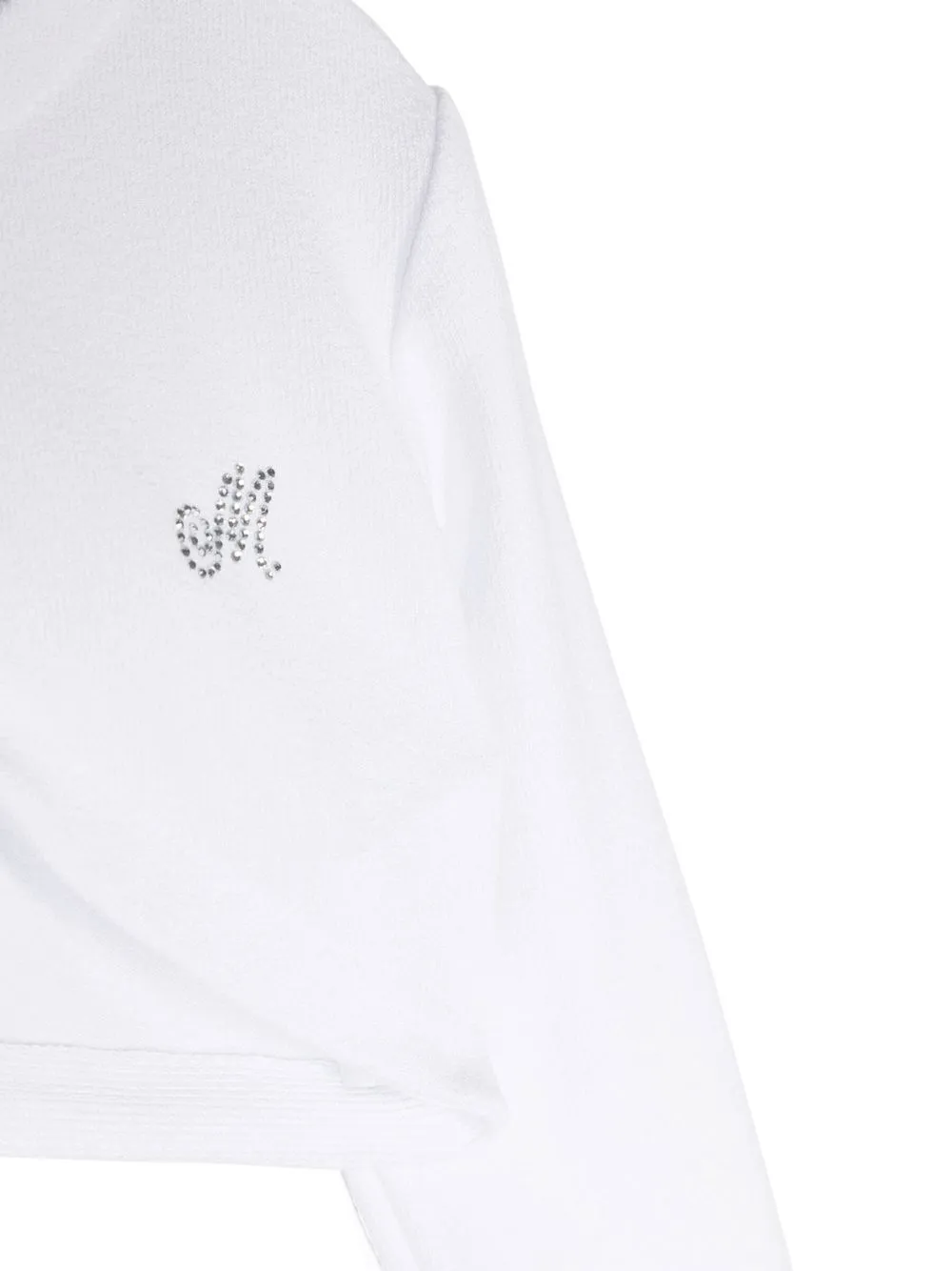 Белый, эластичный материал, ткань джерси, декор из кристаллов, логотип, круглый вырез, застежка на пуговицах спереди, длинные рукава, закругленный подол и укороченная длина.
