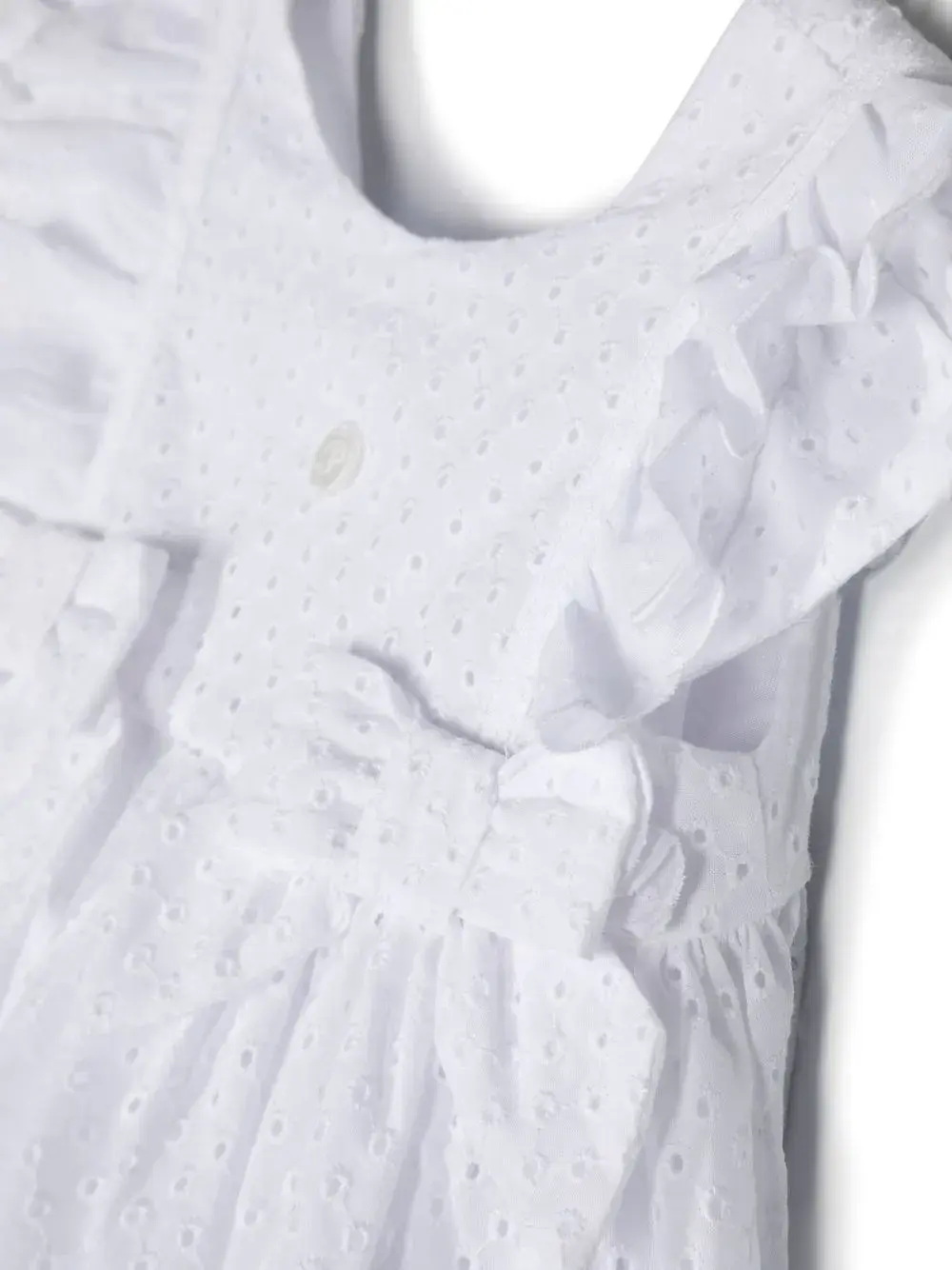 Белый, хлопок, английская вышивка, подвеска с логотипом, бант, вставки с оборками, рукава кап, застежка на пуговицы сзади и прямой подол.