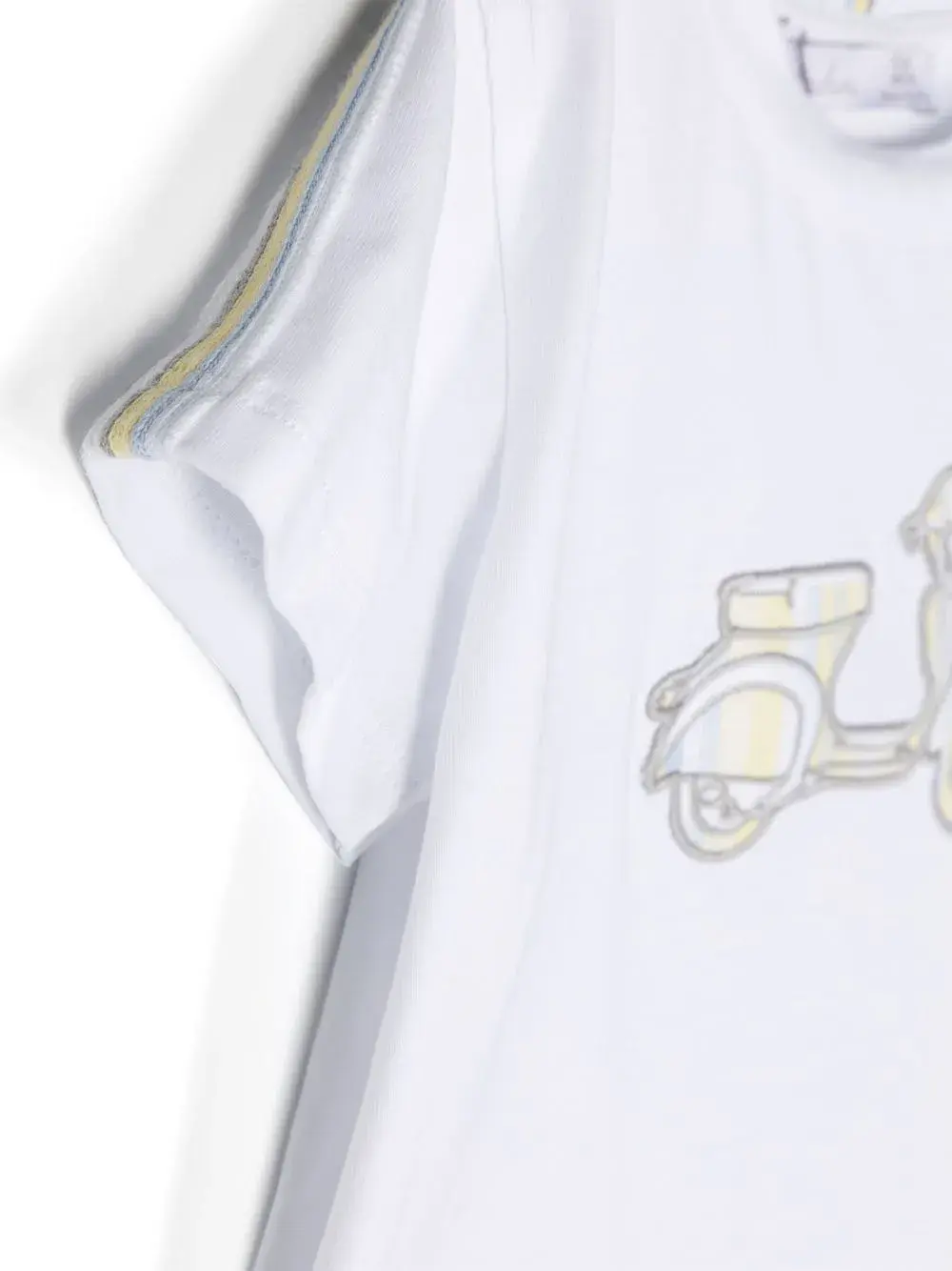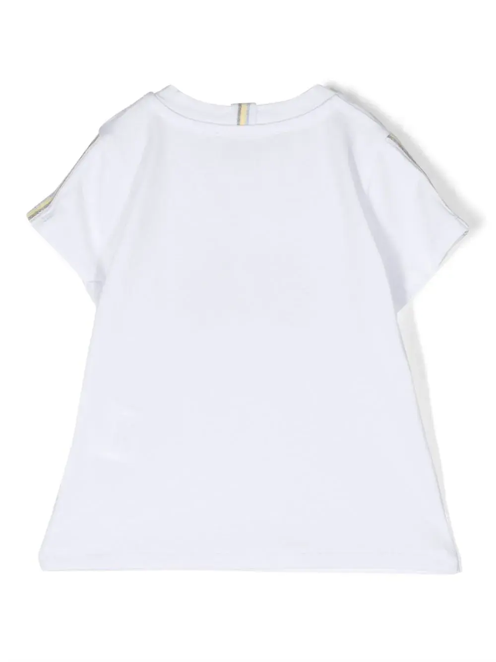 Белый, эластичный хлопок, полоски, круглый вырез, короткие рукава и прямой подол.