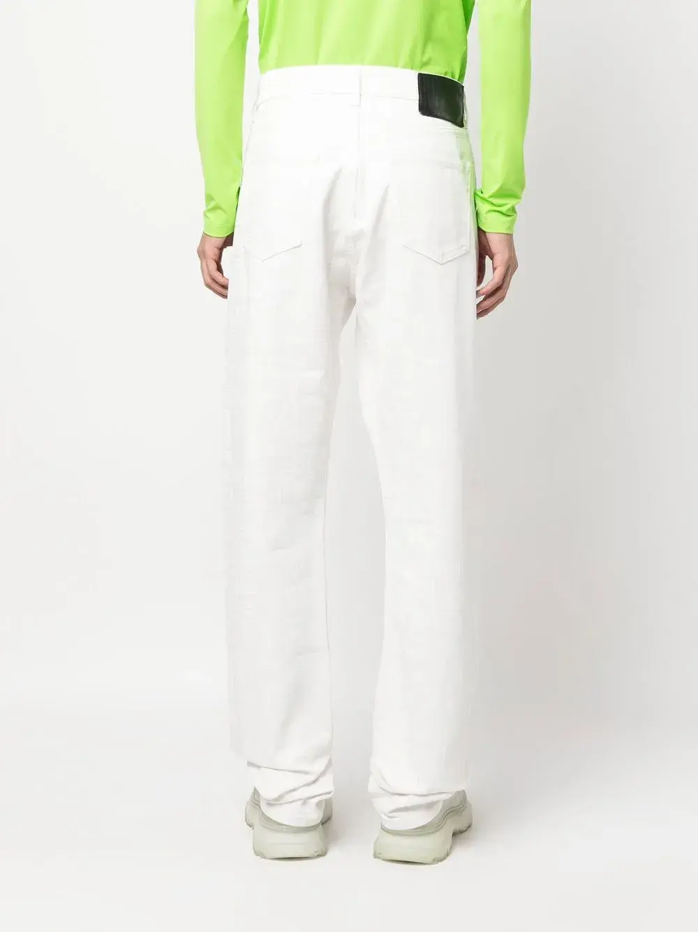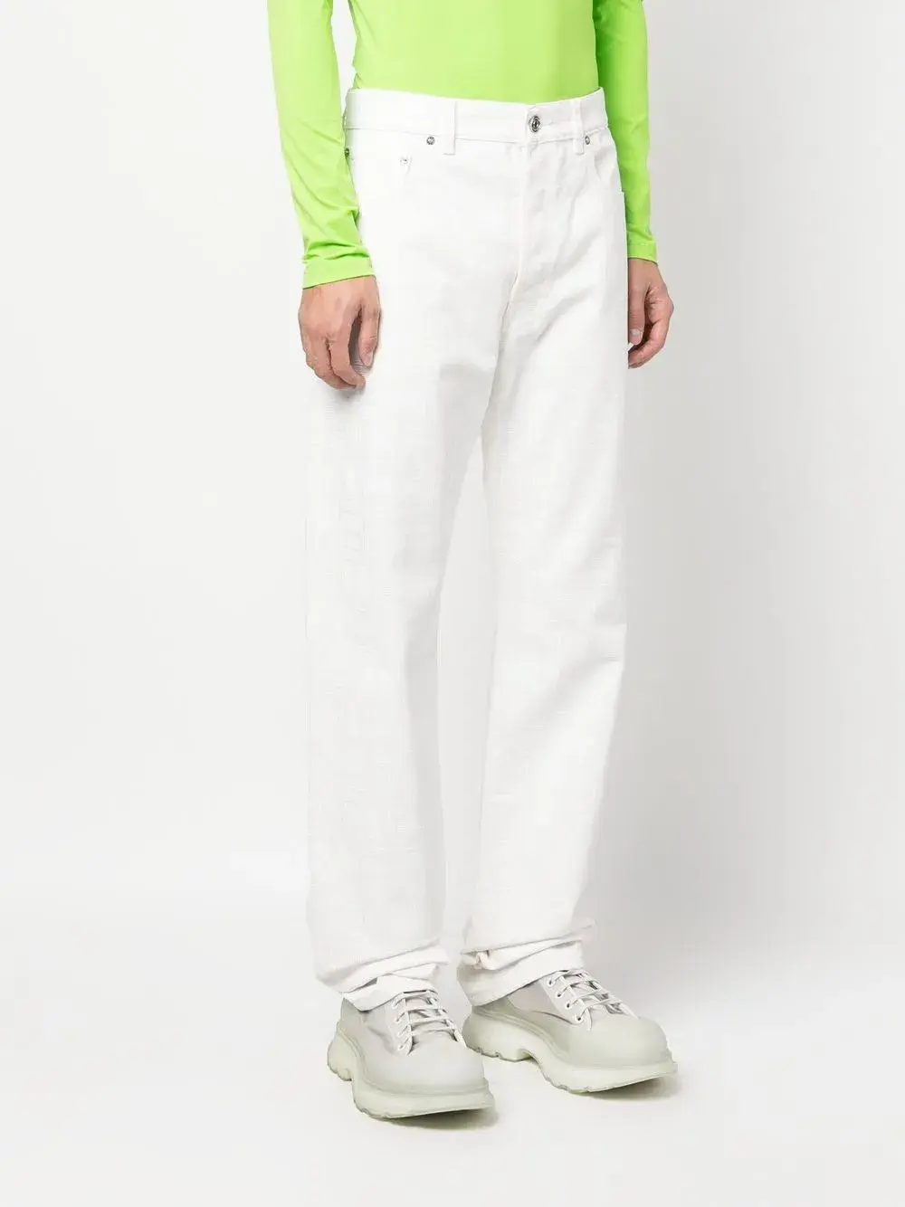 Белый, хлопок, деним, принт с изображением штрихкода, нашивка с логотипом сзади, маленькая подвеска с логотипом, прямой крой, средняя посадка, петли для ремня, потайная застежка на молнии и пуговицах и пять карманов.