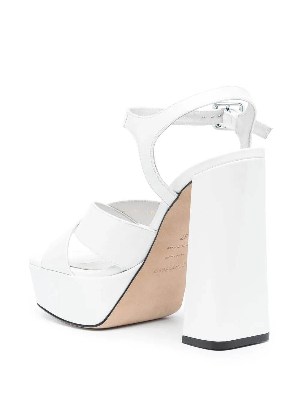 Белый, телячья кожа, перекрестные ремешки, ремешок на щиколотке с пряжкой, логотип на стельке, высокий блочный каблук и подошва на платформе.