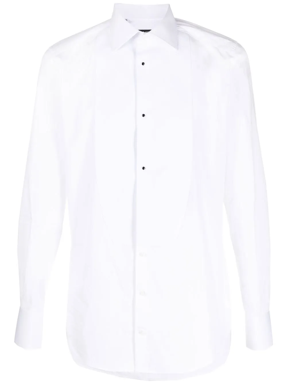 Белый, хлопок, воротник на пуговицах, застежка на пуговицах спереди, длинные рукава, манжеты на пуговицах и закругленный подол.