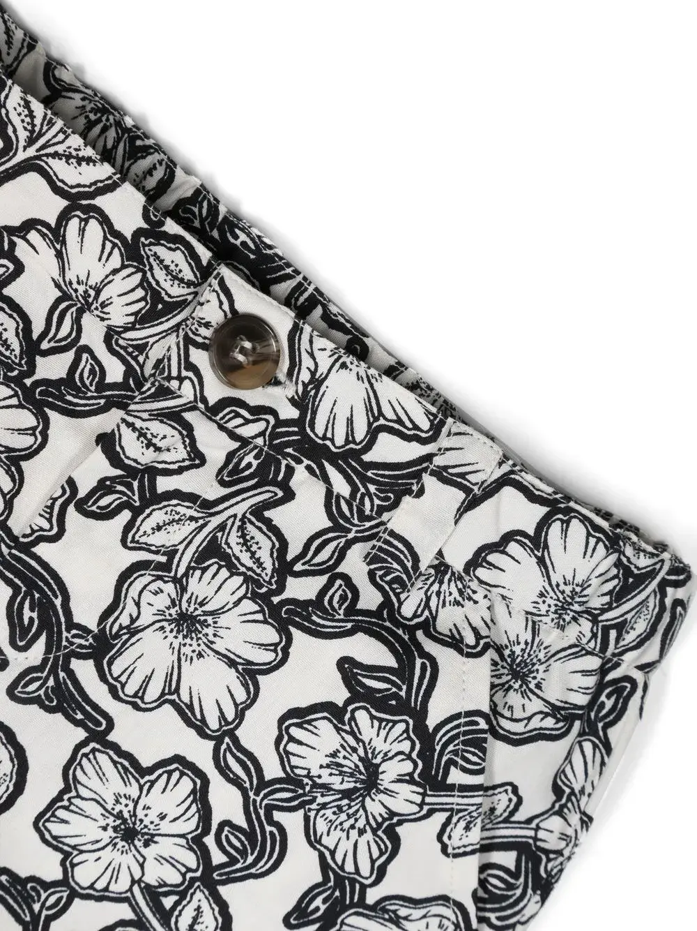 Белый/черный, хлопок, сплошной цветочный принт, потайная застежка на молнии и пуговицах, два кармана по бокам и два кармана с листочкой сзади.