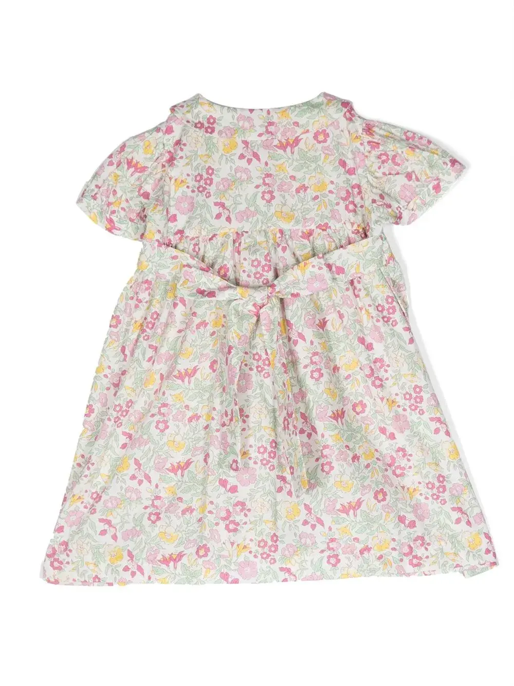 Белый/разноцветный, хлопок, сплошной цветочный принт, воротник Питер Пэн, застежка на пуговицах спереди, застежка на завязке сзади, короткие рукава и плиссированная юбка.
