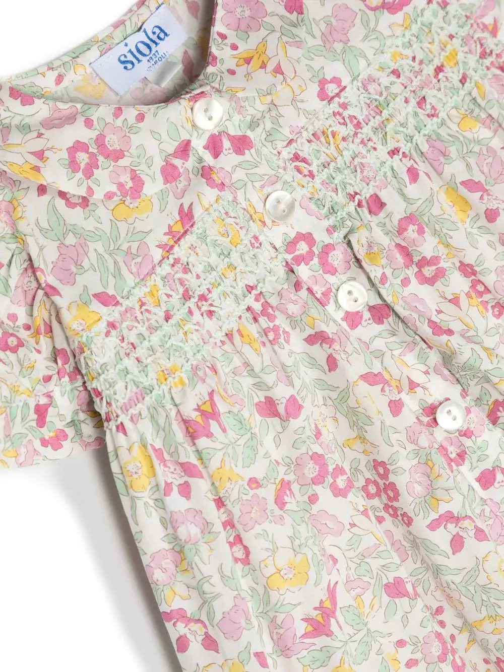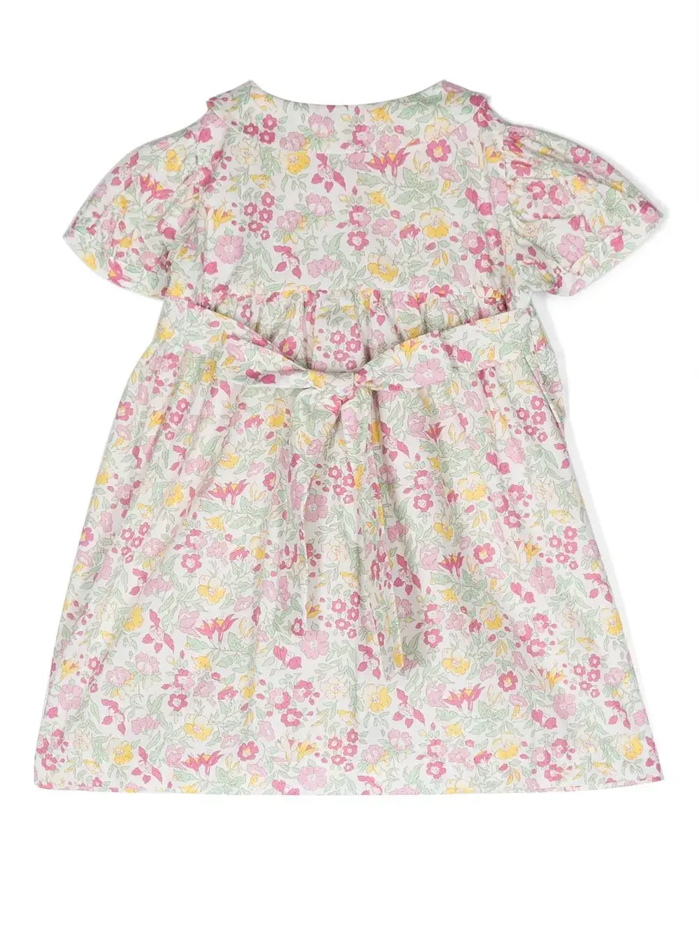 Белый/разноцветный, хлопок, сплошной цветочный принт, воротник Питер Пэн, застежка на пуговицах спереди, застежка на завязке сзади, короткие рукава и плиссированная юбка.