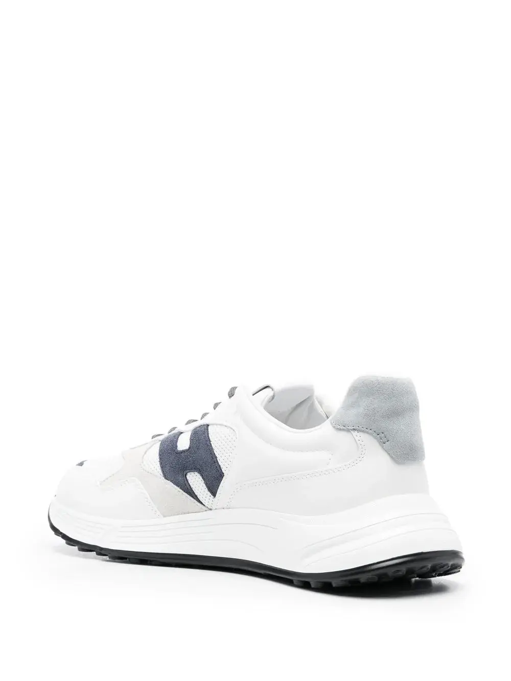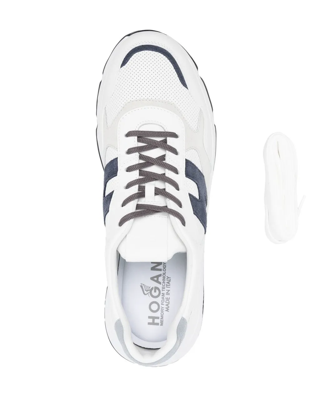 Синий/белый, серый, телячья кожа, закругленный носок, нашивка с логотипом на язычке, шнуровка спереди и массивная резиновая подошва.