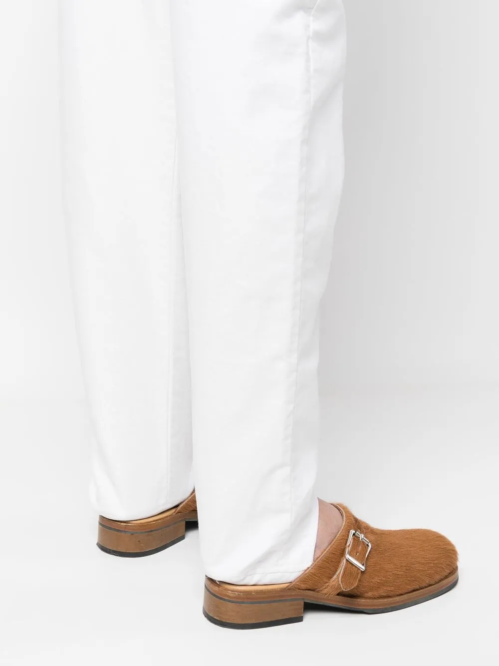 Белый, хлопок, узкий крой, потайная застежка спереди, передние карманы на молнии и два кармана на молнии сзади. Это унисекс-модель. Обратите внимание, что для нее используется мужская размерная сетка.
