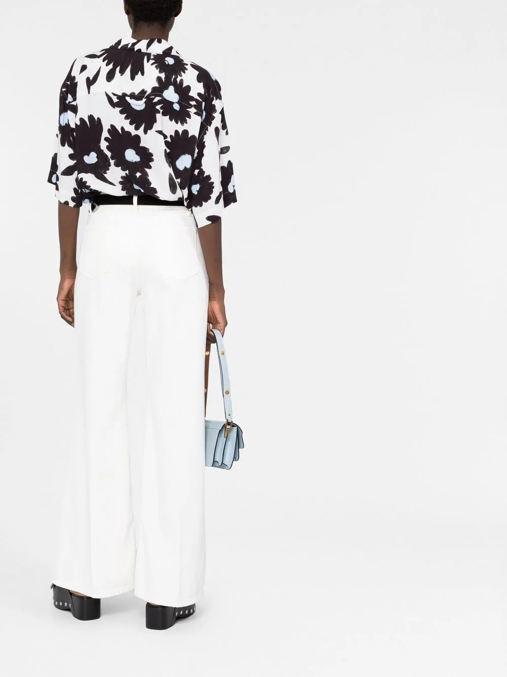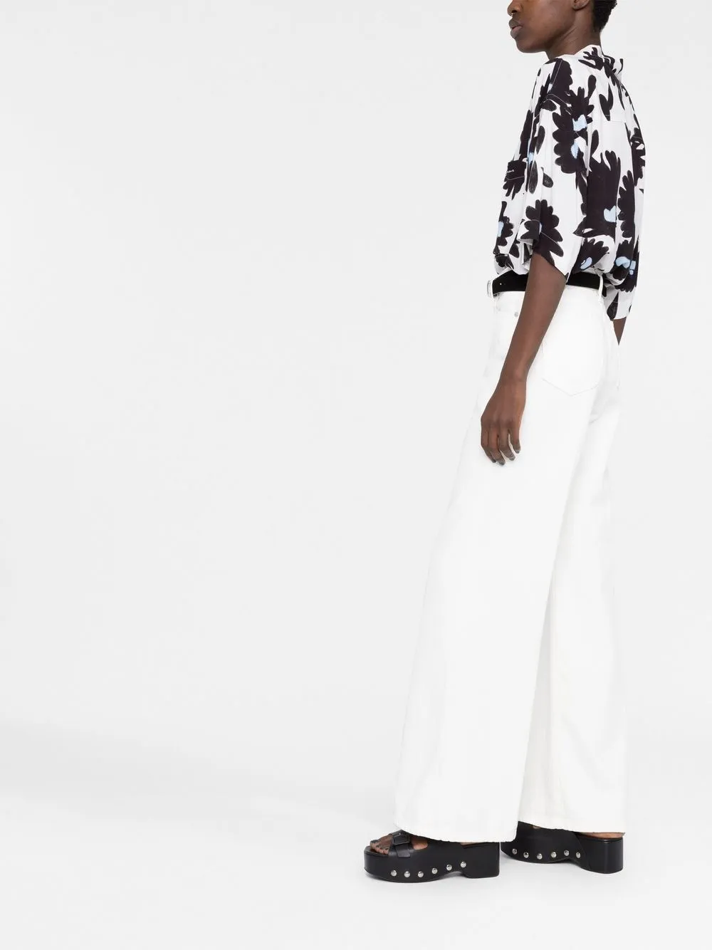 Белый, хлопок, застежка на молнии и пуговице спереди, петли для ремня, два кармана по бокам, два накладных кармана сзади и расклешенный крой.