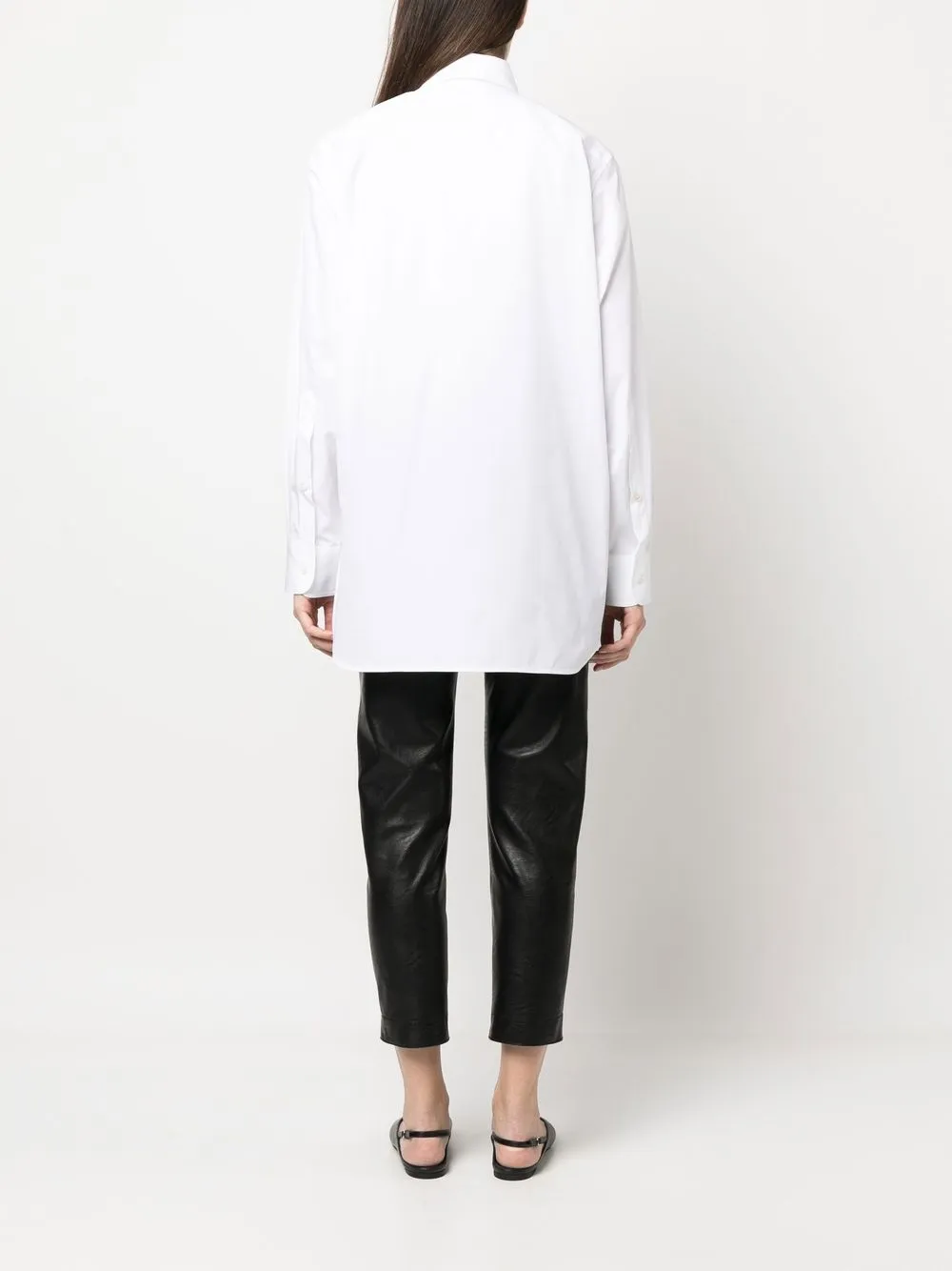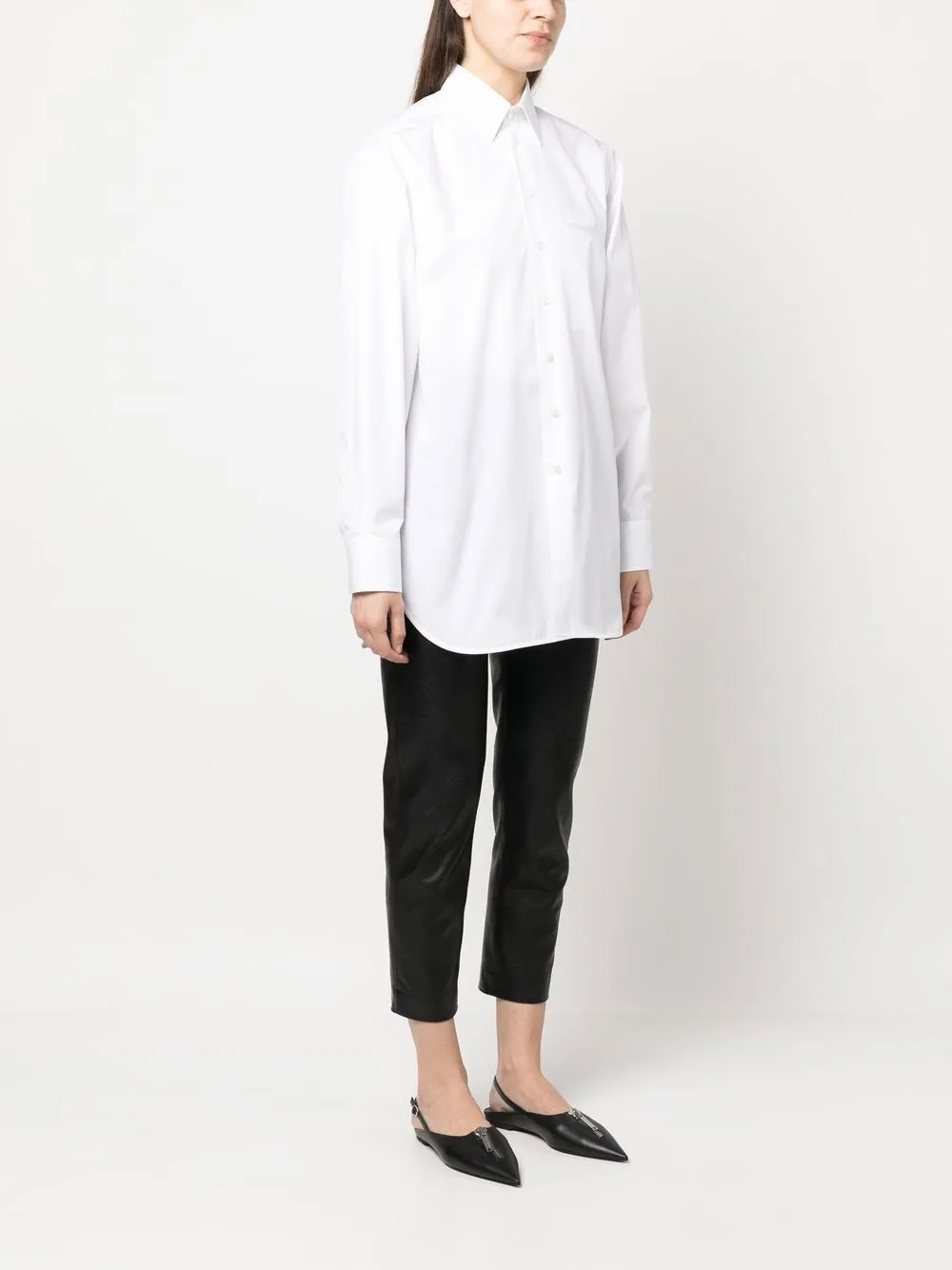 Белый, хлопок, прямой воротник, застежка на пуговицах спереди, длинные рукава, манжеты на пуговицах и закругленный подол. Узнать больше о том, какие товары получают отметку «Ответственный выбор», можно из материала «Как мы оцениваем экологичность и этичность».