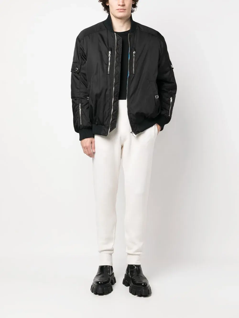 Смесовый кашемир, тонкая вязка, треугольный логотип, пояс в рубчик, эластичный пояс, два вшитых кармана по бокам, накладной карман сзади и узкий крой.