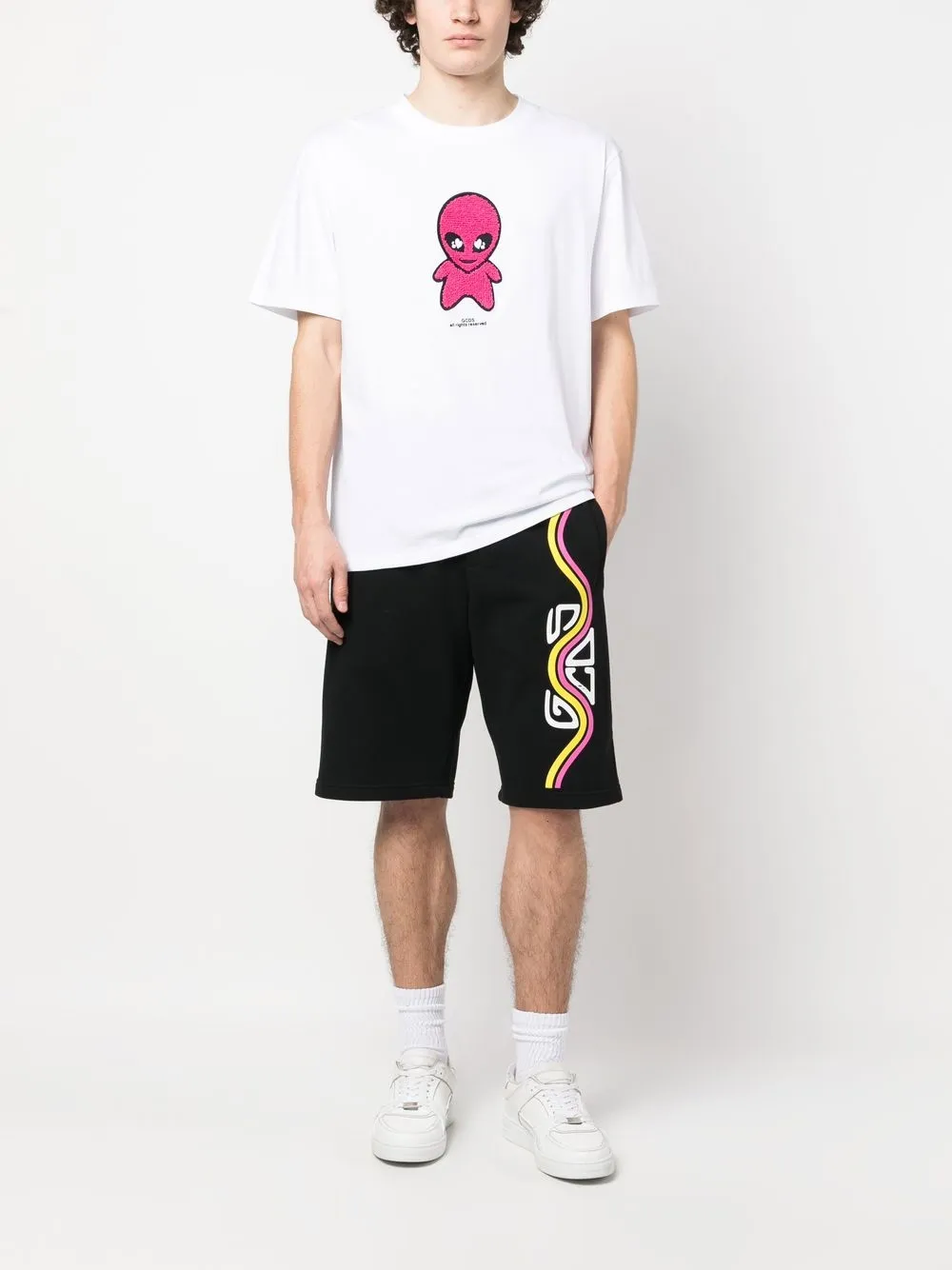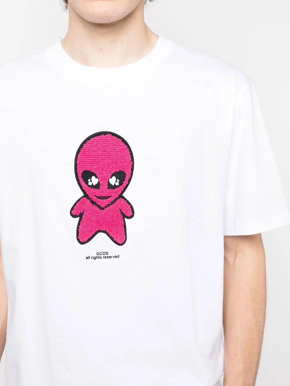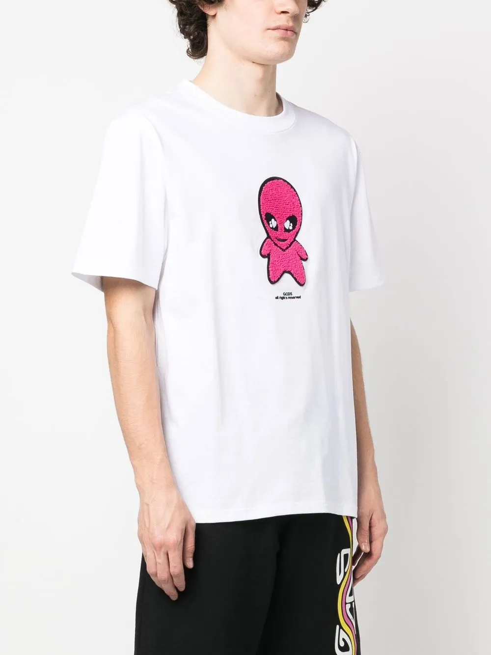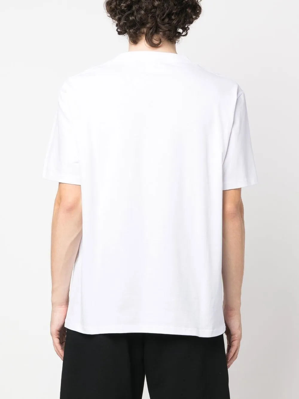 Расцветка Cloud White, хлопок, вышитый узор, логотип спереди, круглый вырез, короткие рукава и прямой подол.