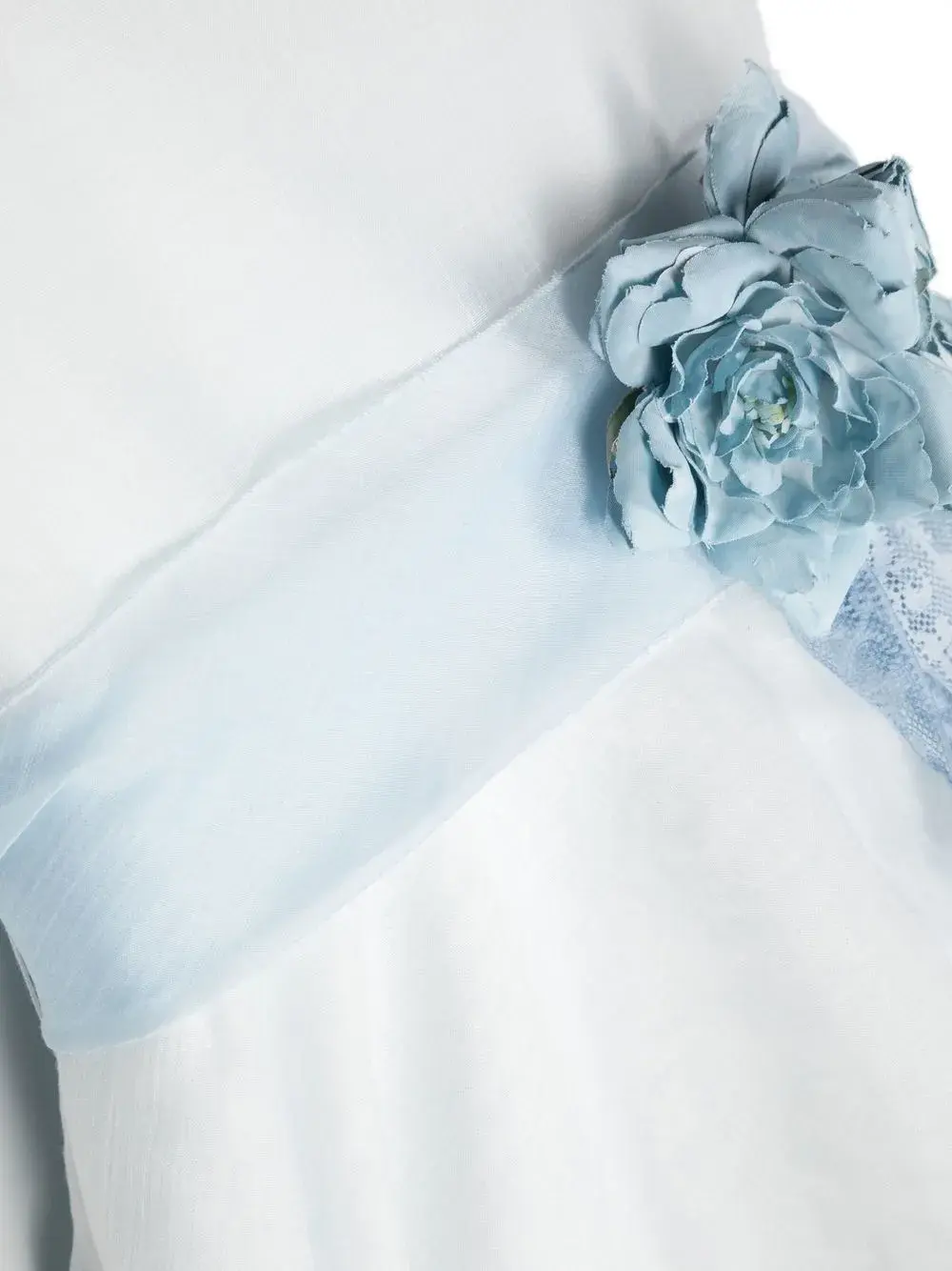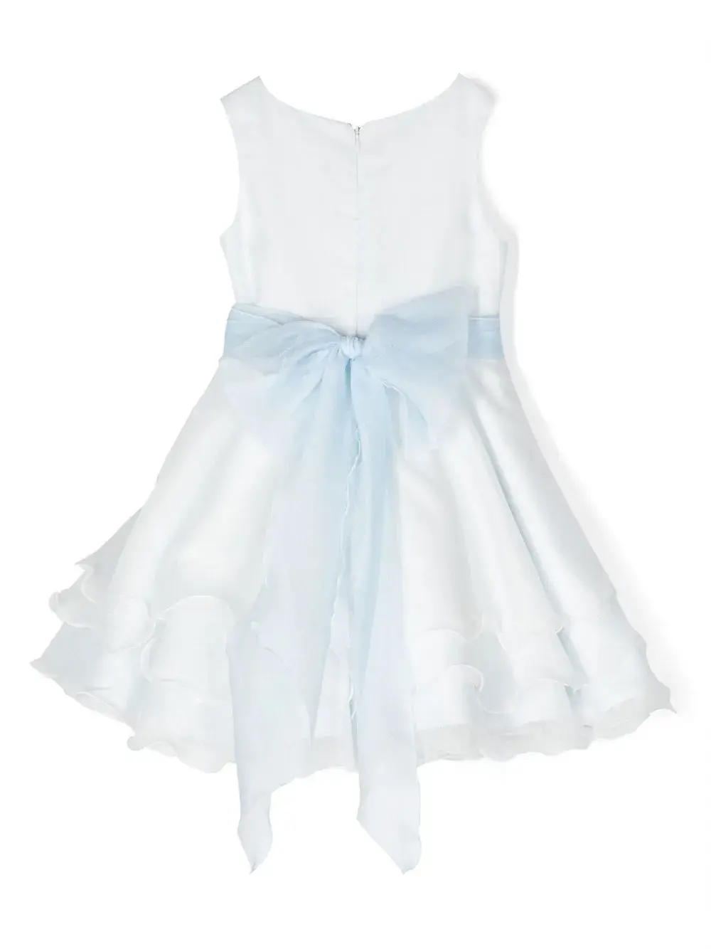 Синий/белый, смесовый хлопок, верхний слой из тюля, цветочная аппликация, ярусная юбка, кулиска на талии, вырез-лодочка, потайная застежка на молнии сзади, без рукавов и длина миди.
