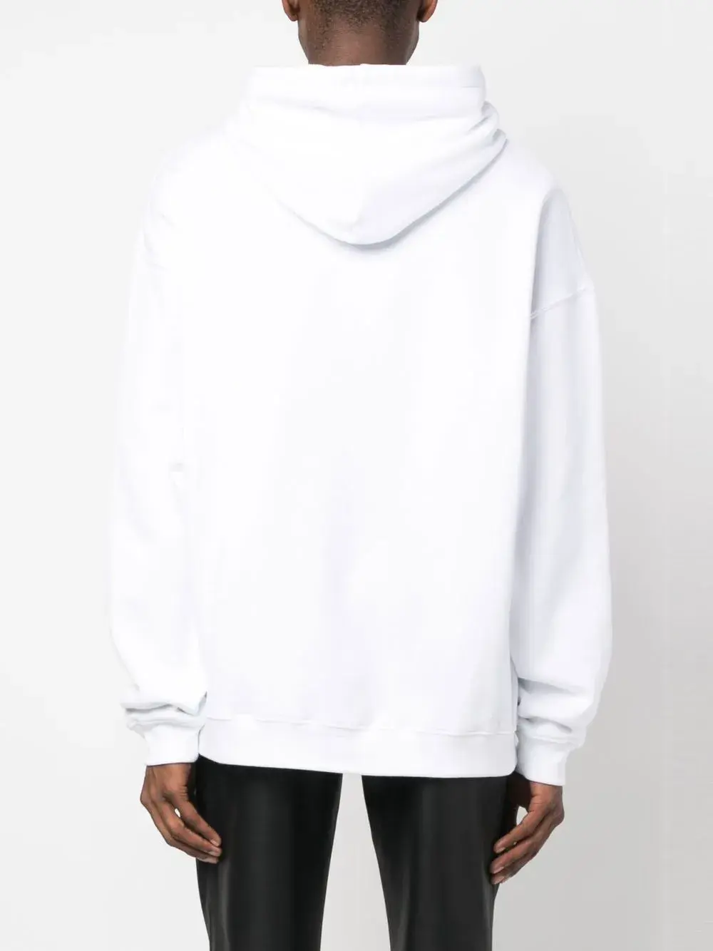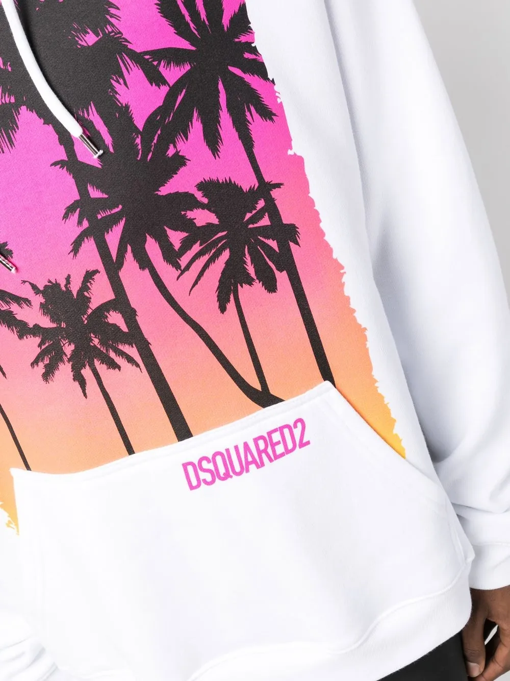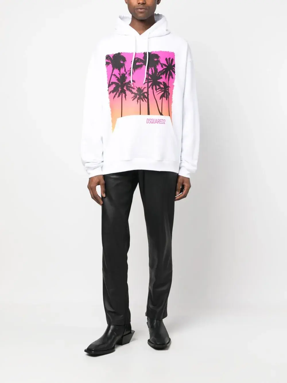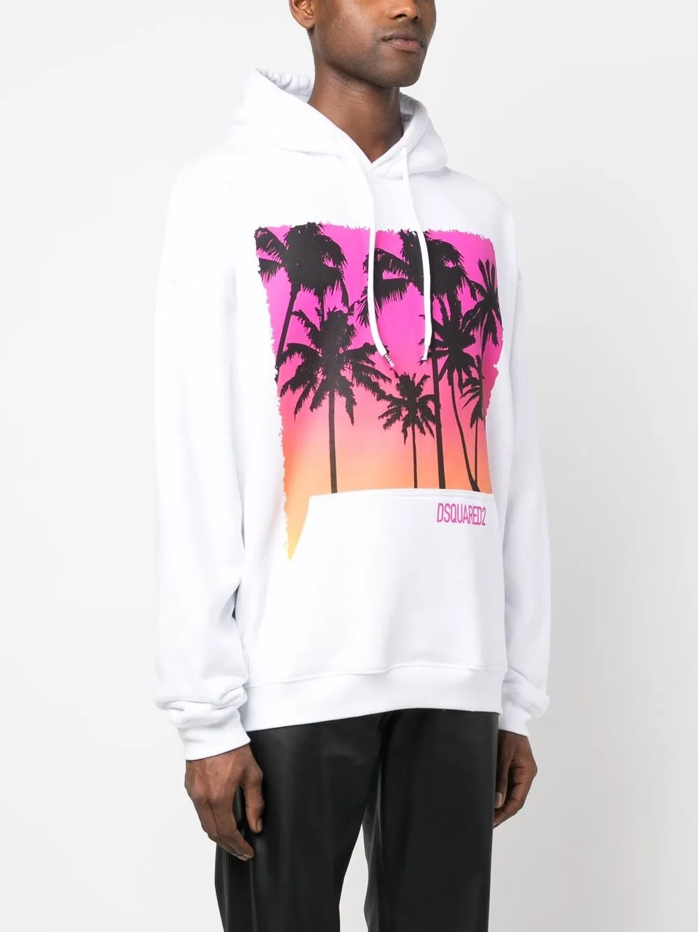Белый, хлопок, принт с изображением пальм, затягивающийся на шнурок капюшон, логотип спереди, карман-муфта, удлиненные рукава и подол в рубчик.