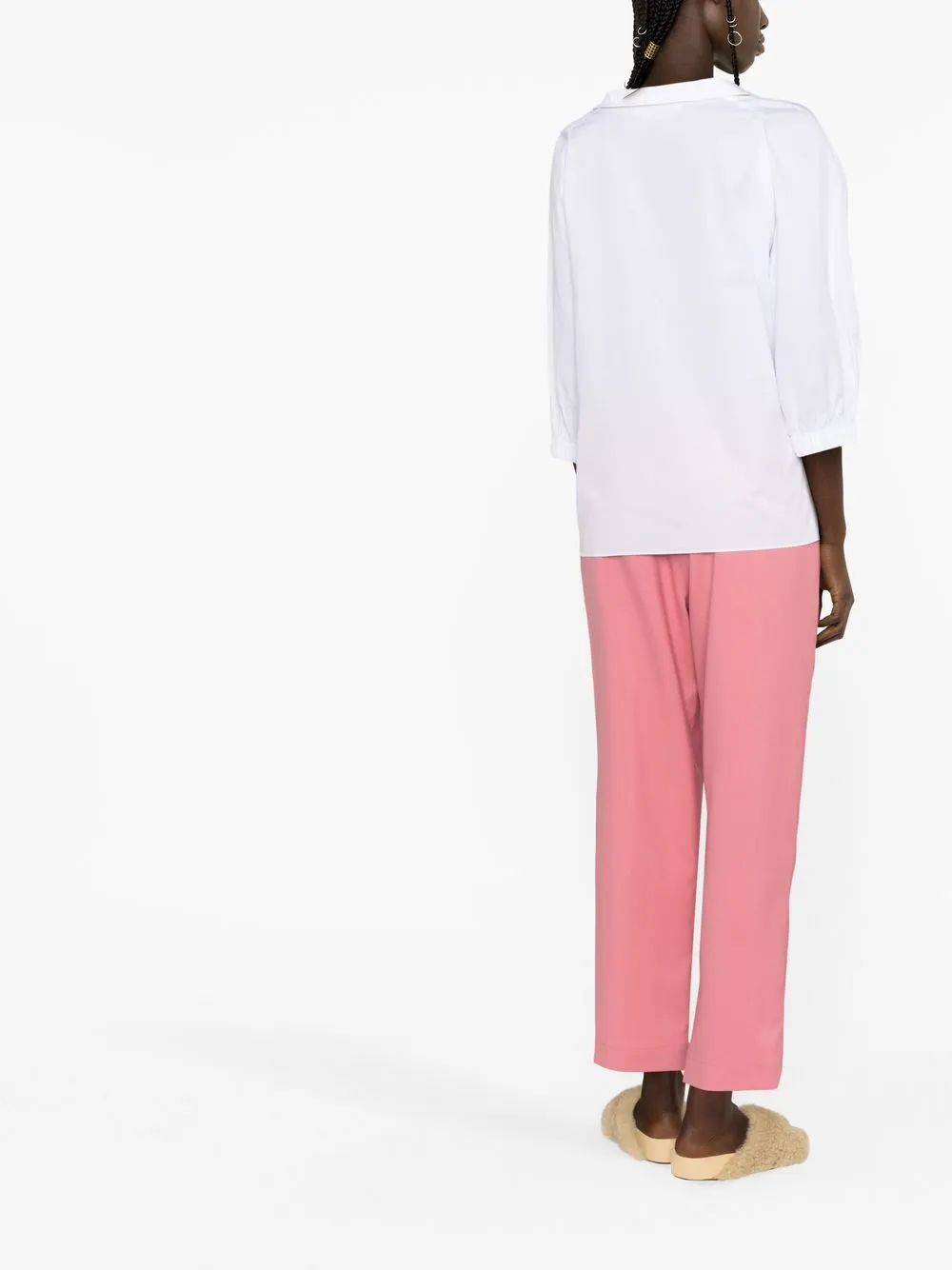 Белый, хлопок, принт с логотипом на груди, V-образный вырез, отложной воротник, рукава три четверти и прямой подол.