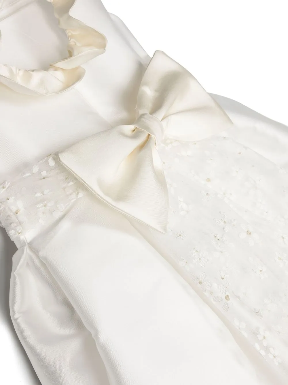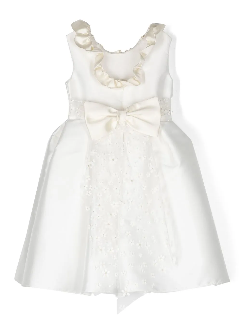 Белый, хлопок, складки, цветочная вышивка, бант, круглый вырез, воротник с оборками, застежка на молнии сзади и без рукавов.