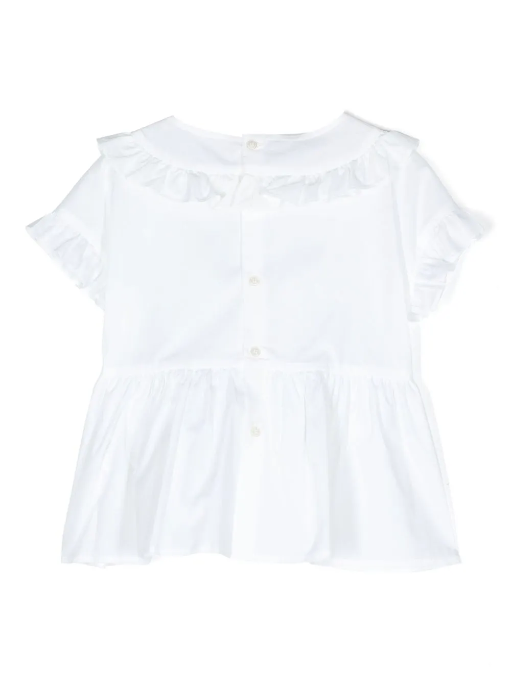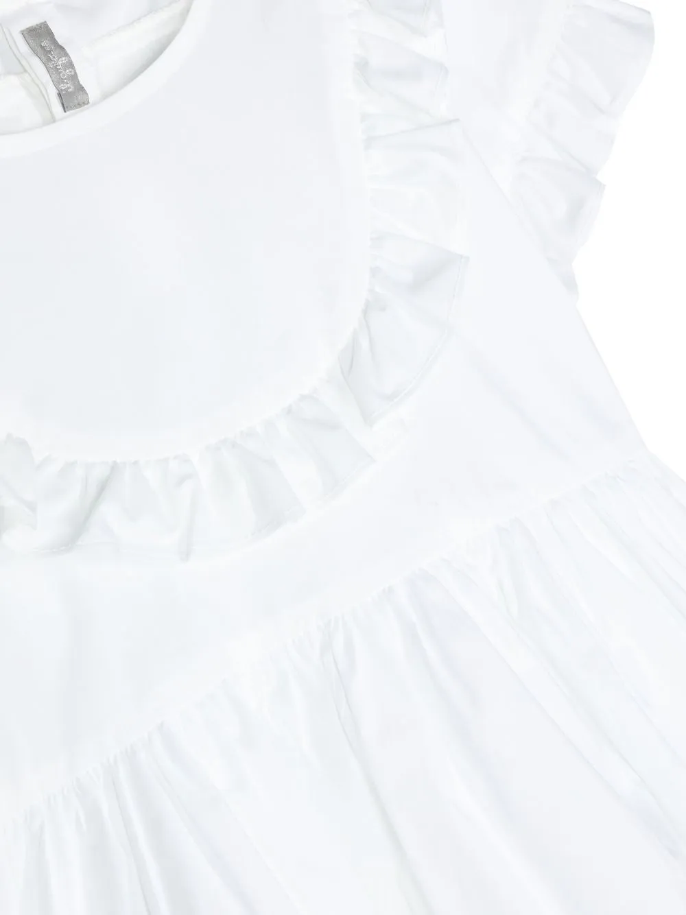 Смесовый хлопок, белый, вставки с оборками, круглый вырез и подол с оборками.