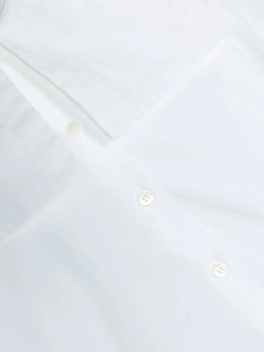 Белый, смесовый хлопок, длинные рукава, застежка на пуговицах спереди и манишка.