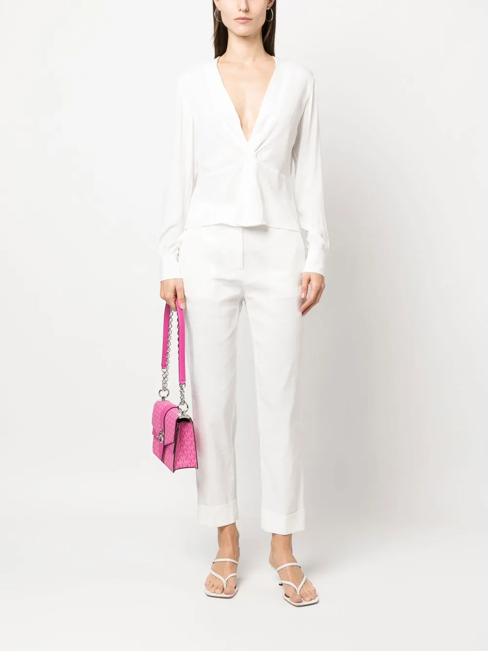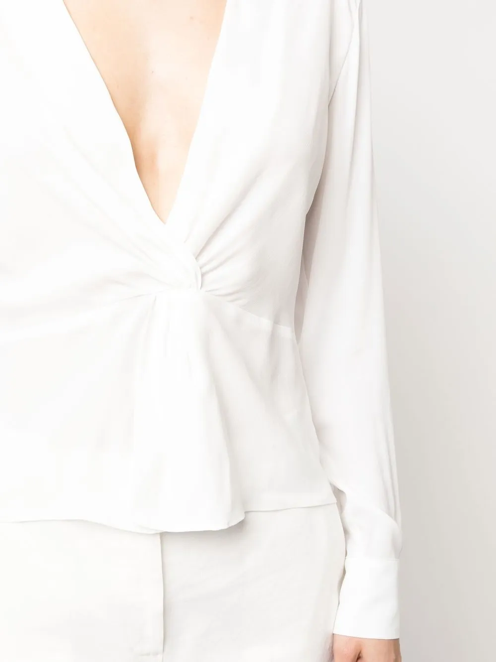 Белый, перекрученная деталь, глубокий V-образный вырез, подол с баской, длинные рукава, манжеты на пуговицах и прямой подол.