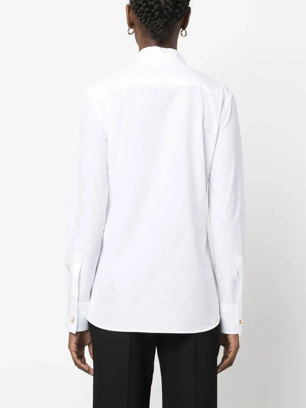 Белый, хлопок, поплин, прямой воротник, длинные рукава, застежка на пуговицах спереди и нагрудный накладной карман.