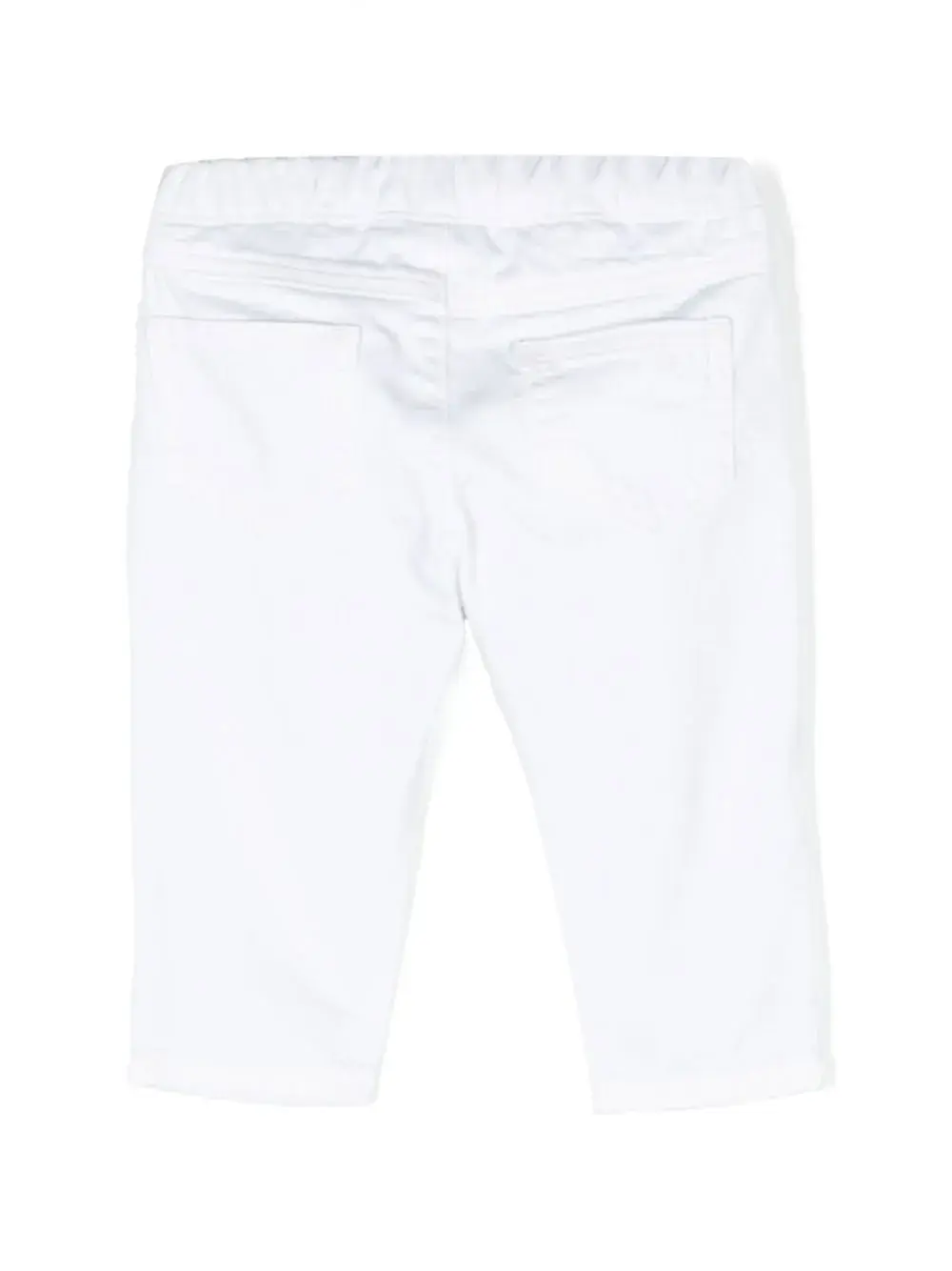 Белый, эластичный хлопок, эластичный пояс, пять карманов и зауженный крой.