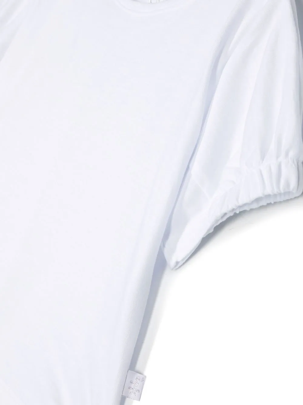 Белый, хлопок, круглый вырез, застежка на пуговицы сзади, короткие рукава, эластичные манжеты и прямой подол.