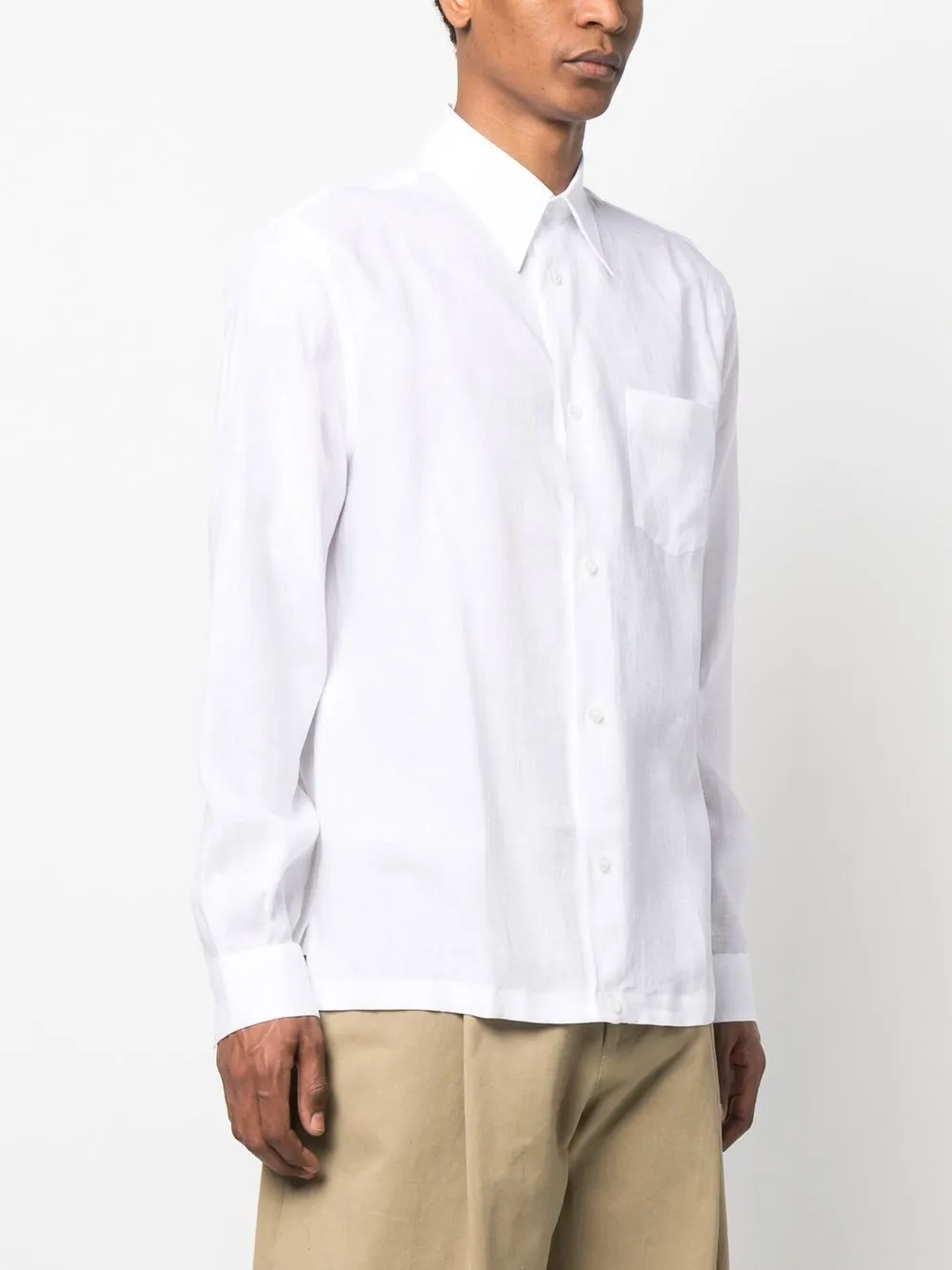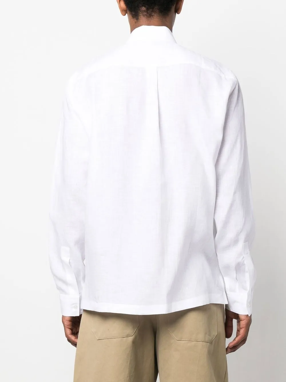 Белый, лен, металлический логотип, классический воротник, застежка на пуговицах спереди, длинные рукава, нагрудный накладной карман и прямой подол. Ответственный выбор: Этот товар как минимум на 50% состоит из материалов, которые признаны более безопасными для окружающей среды или сертифицированы независимыми организациями.