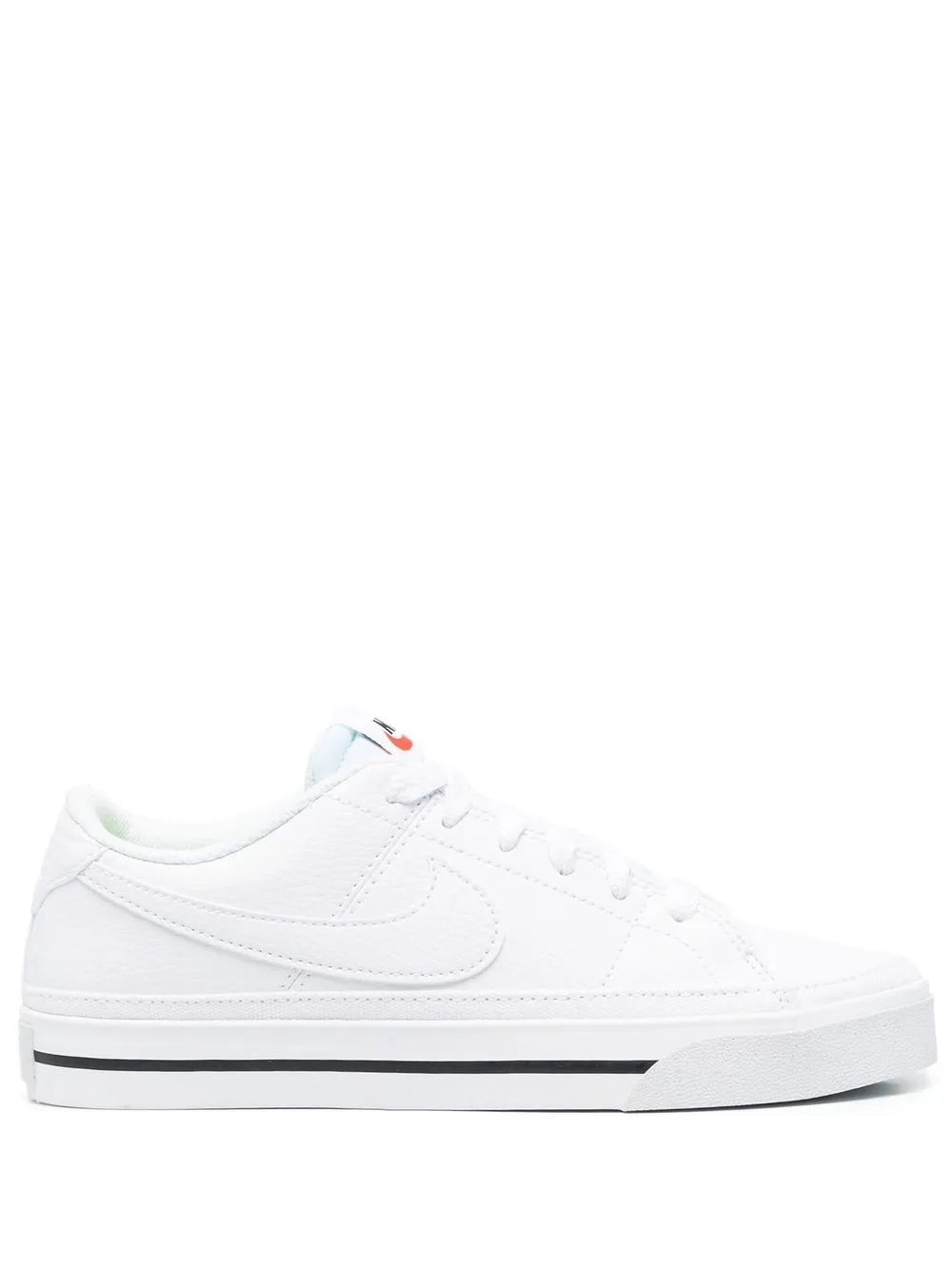 Белый/черный, телячья кожа, логотип Nike Swoosh, нашивка с логотипом на язычке, задник с логотипом, отделка в полоску, шнуровка спереди, закругленный носок, логотип на стельке и плоская резиновая подошва.