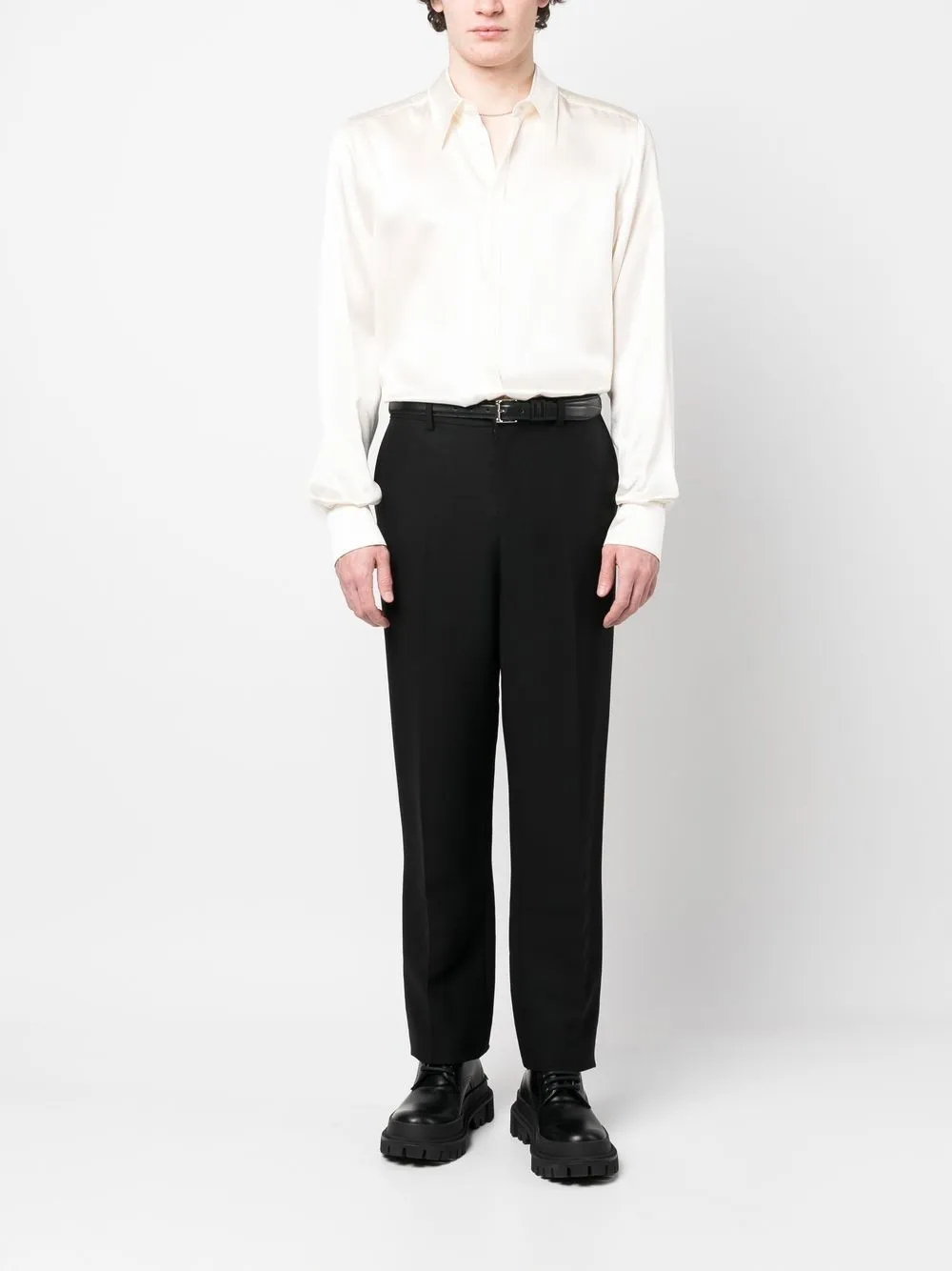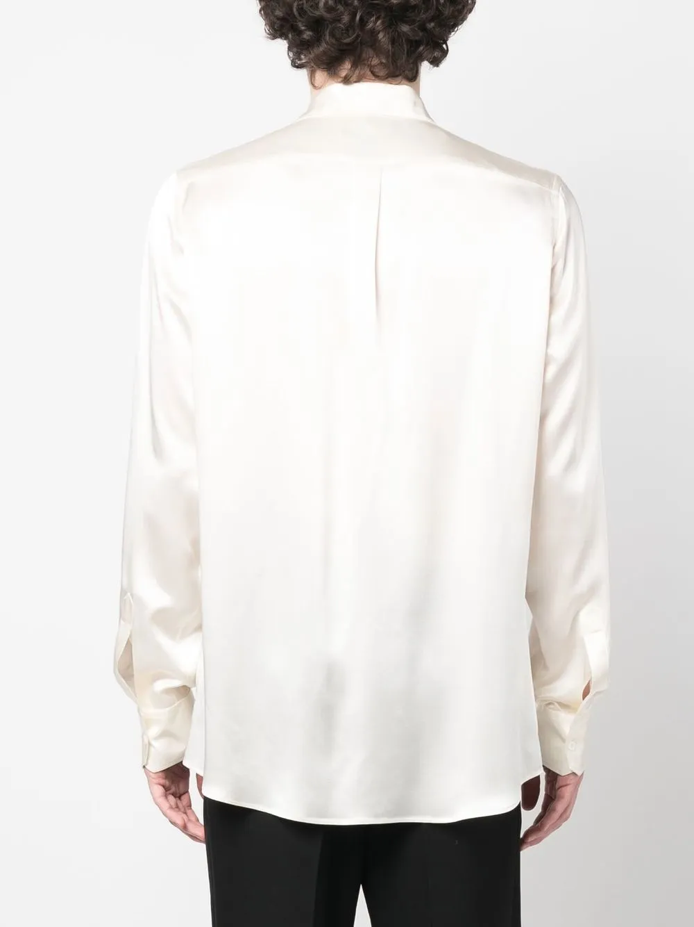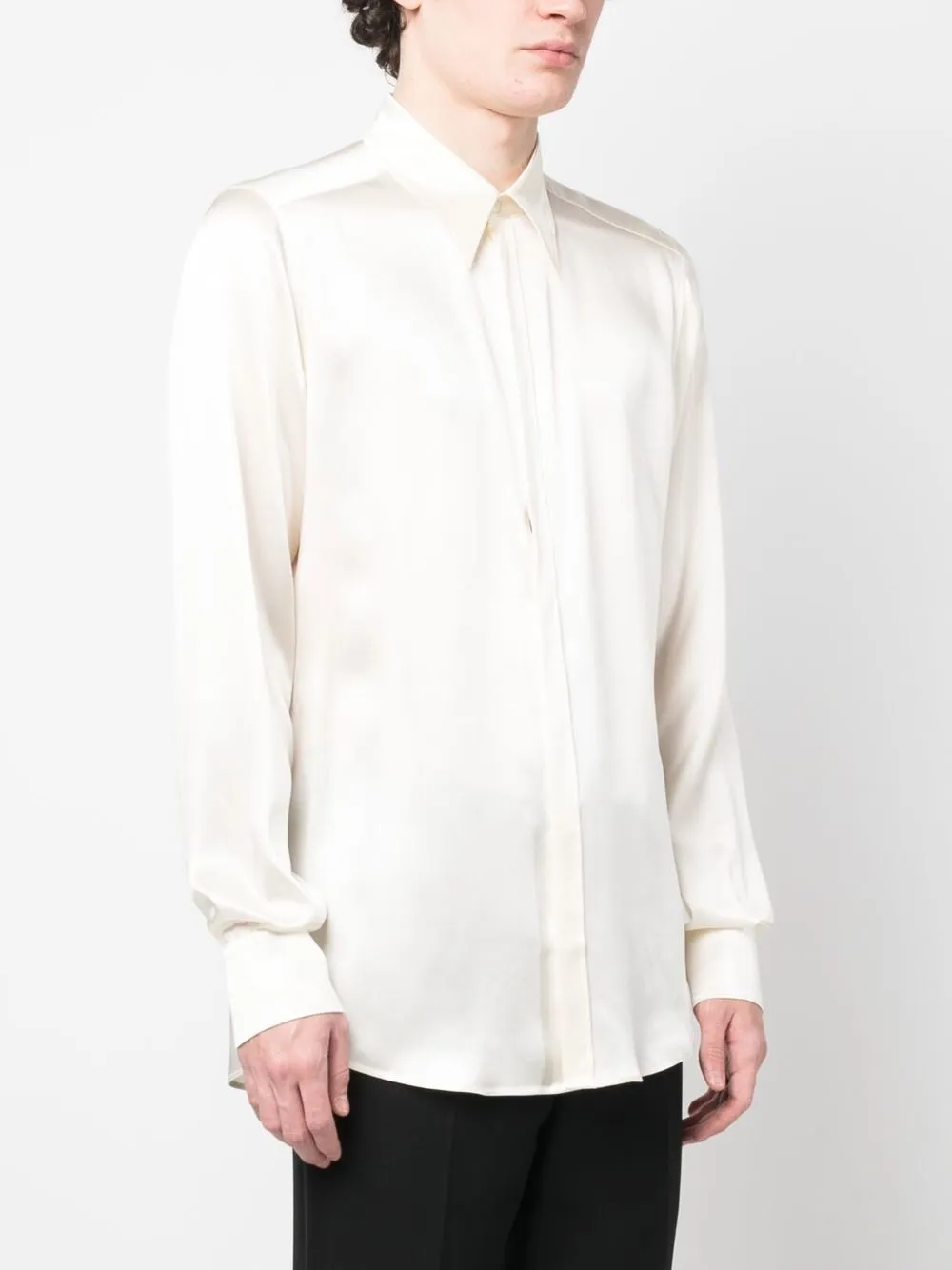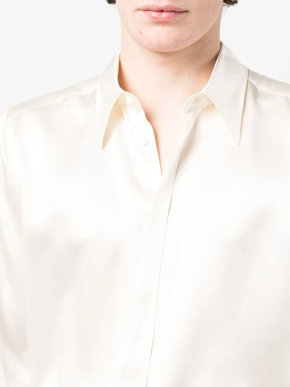 Кремово-белый, шелк, классический воротник, длинные рукава, манжеты на пуговицах, закругленный подол и потайная пуговичная застежка спереди.