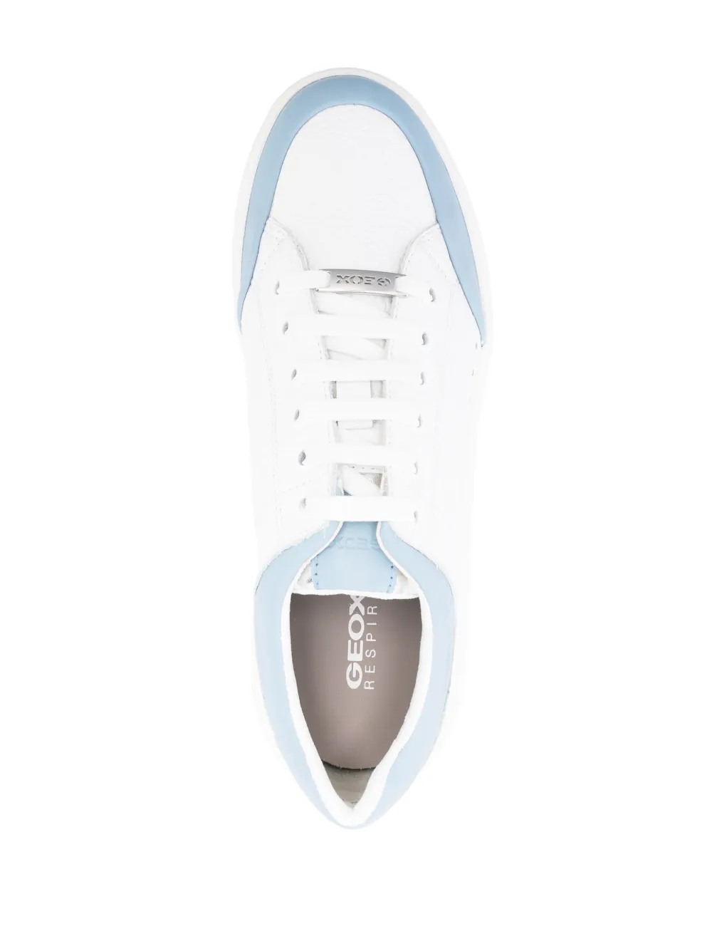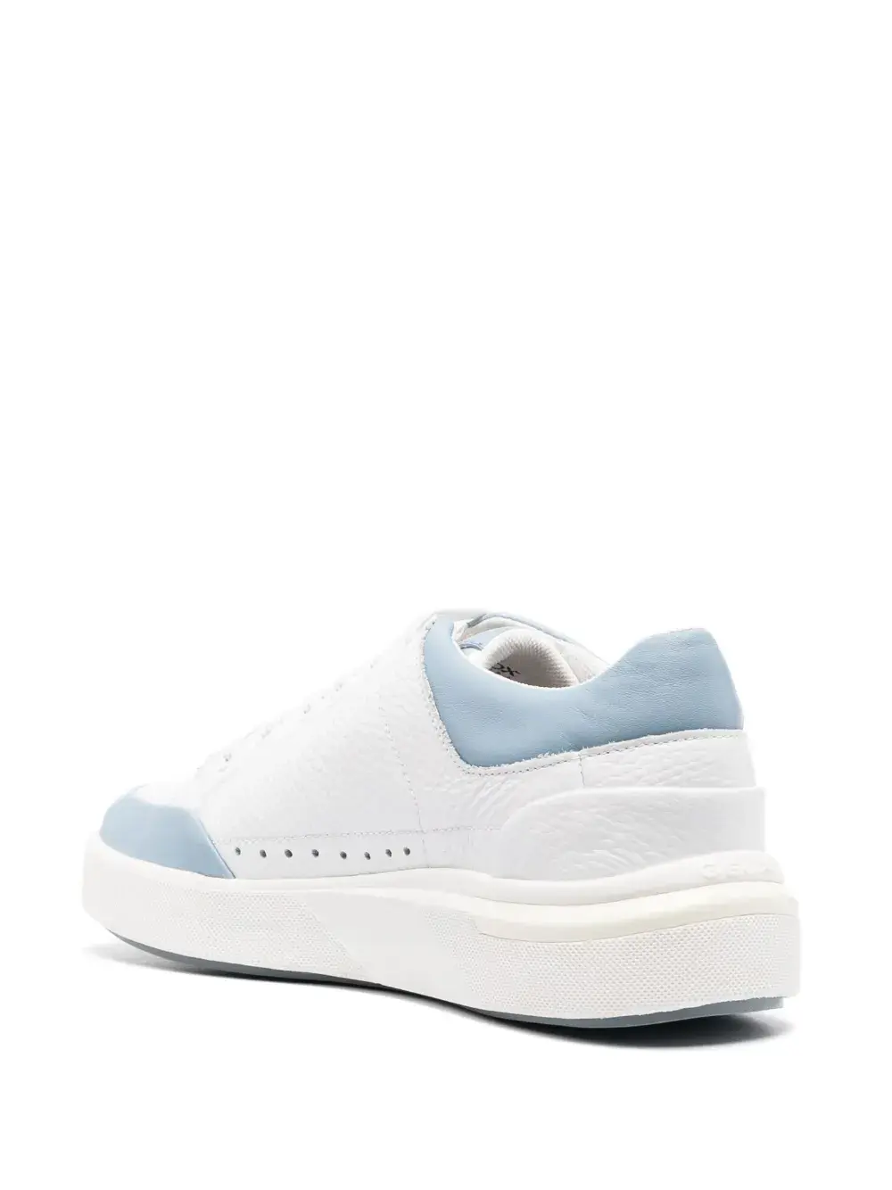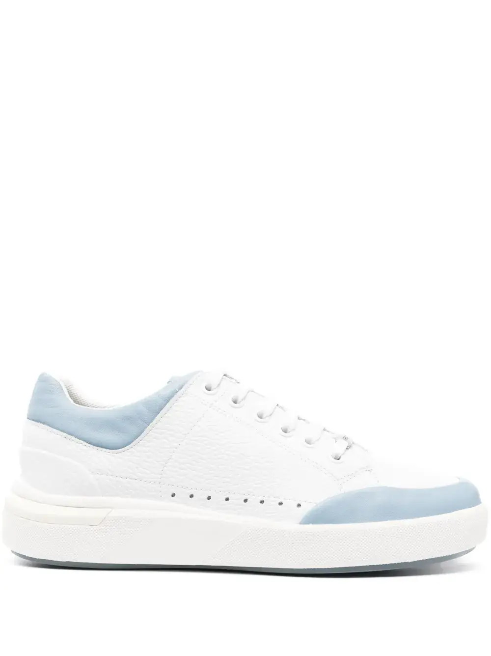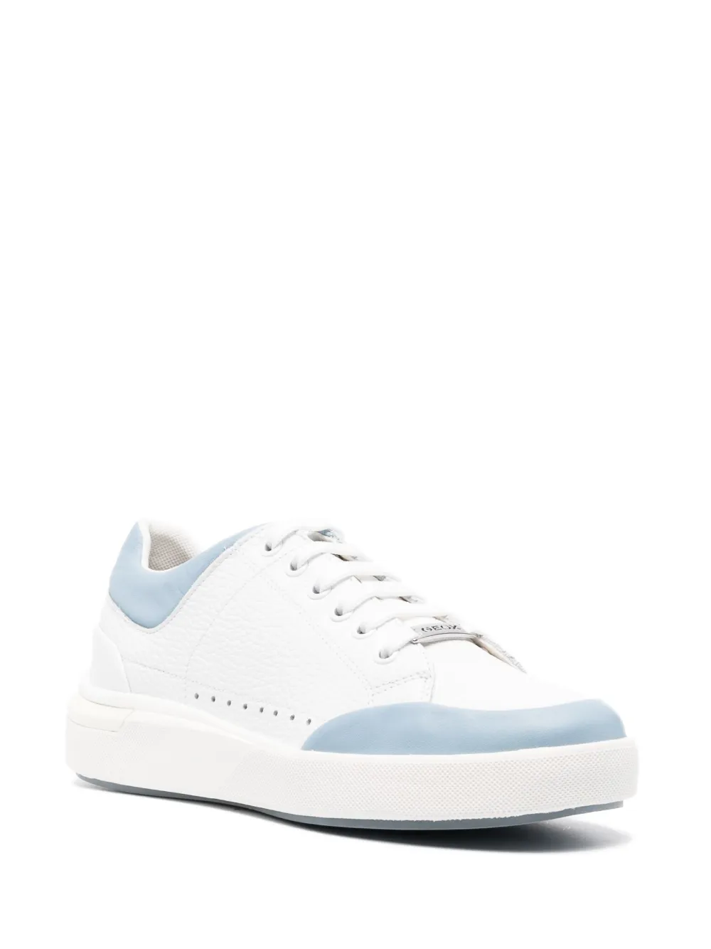 Серовато-белый, голубой, телячья кожа, зернистая текстура, вставки, серебристый металлический логотип, строчка в тон, перфорация, закругленный носок, шнуровка спереди, стелька с логотипом и плоская резиновая подошва.