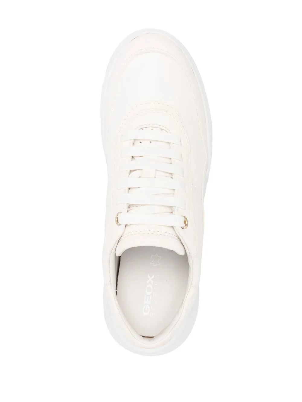 Белый, строчка в тон, закругленный носок, шнуровка спереди, стелька с логотипом и резиновая подошва.