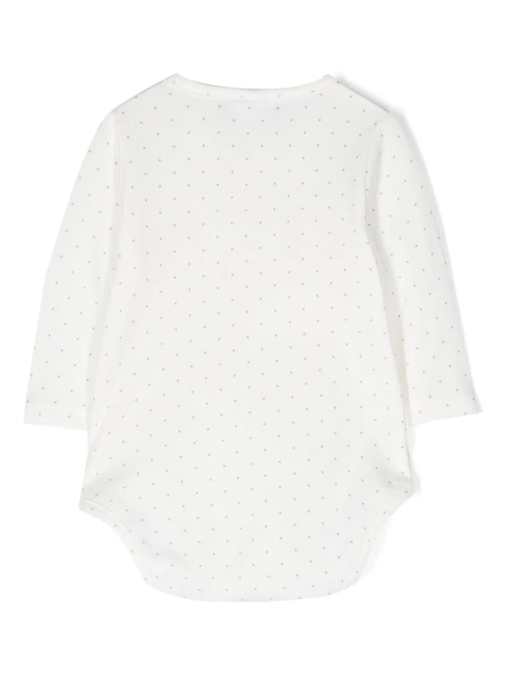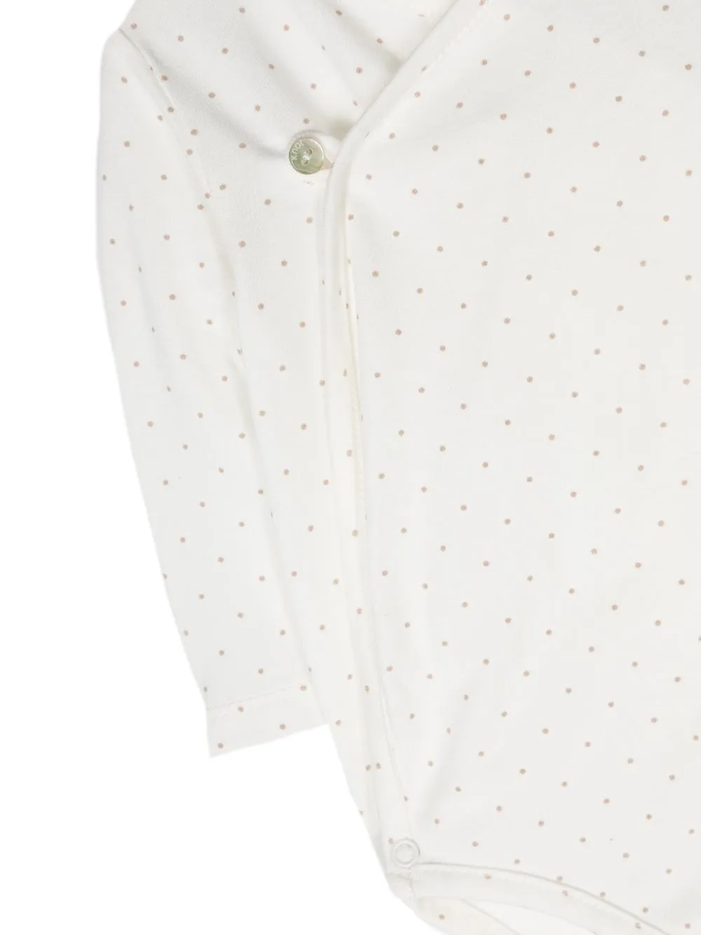 Белый, эластичный хлопок, принт в горох, V-образный вырез, застежка на пуговицах спереди, застежка на кнопках и длинные рукава.