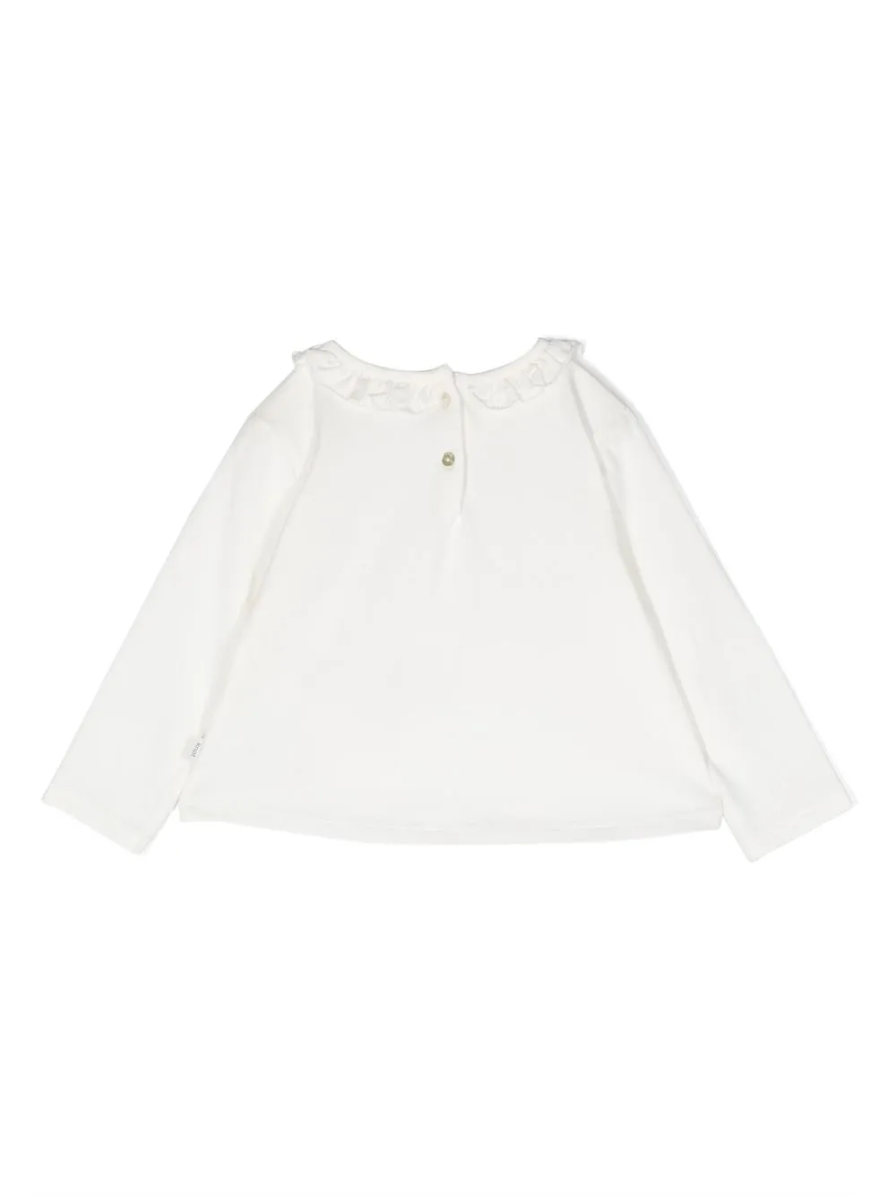Белый, эластичный хлопок, принт на груди, застежка на пуговицы сзади, воротник с оборками, длинные рукава и прямой подол.