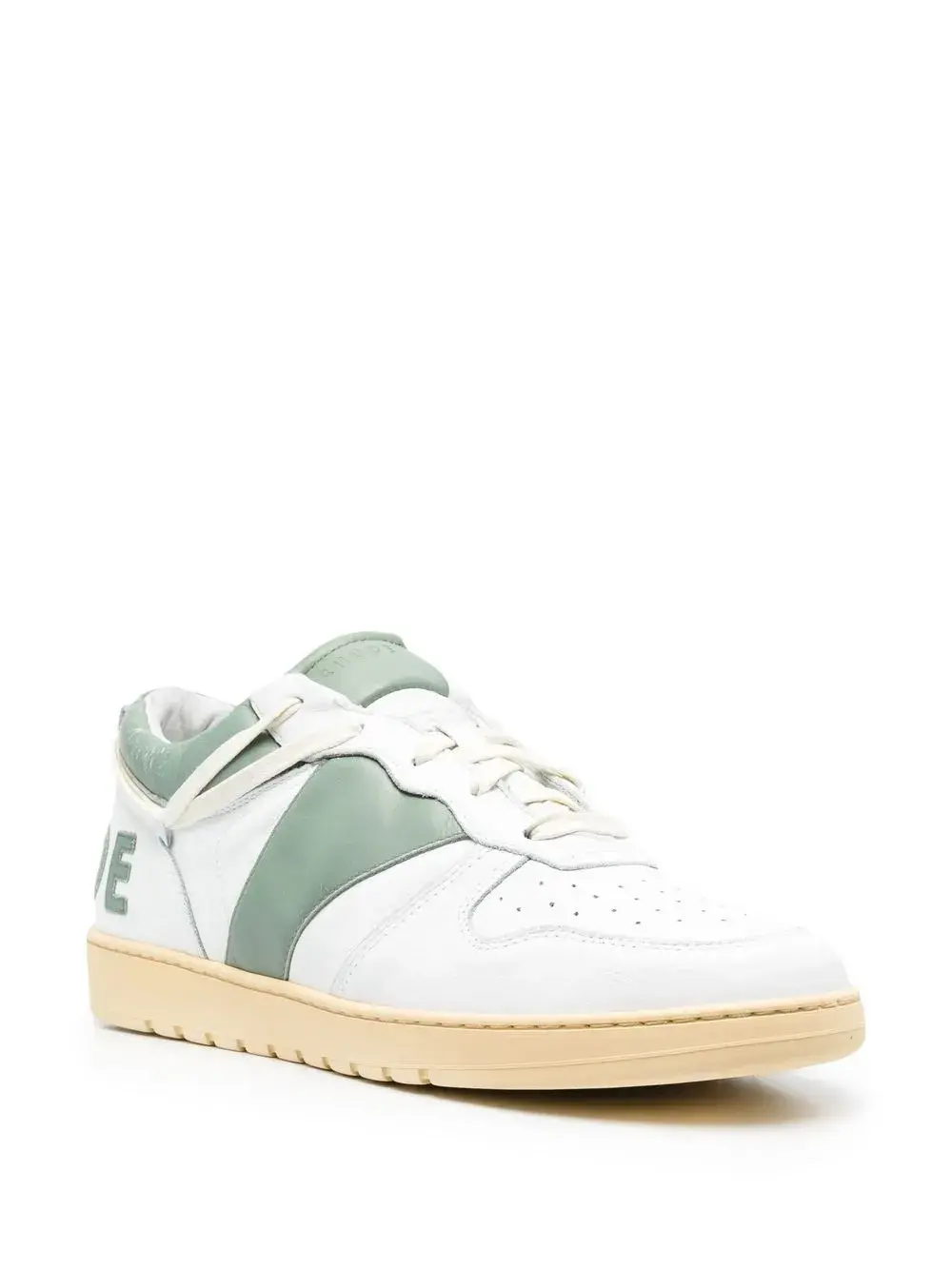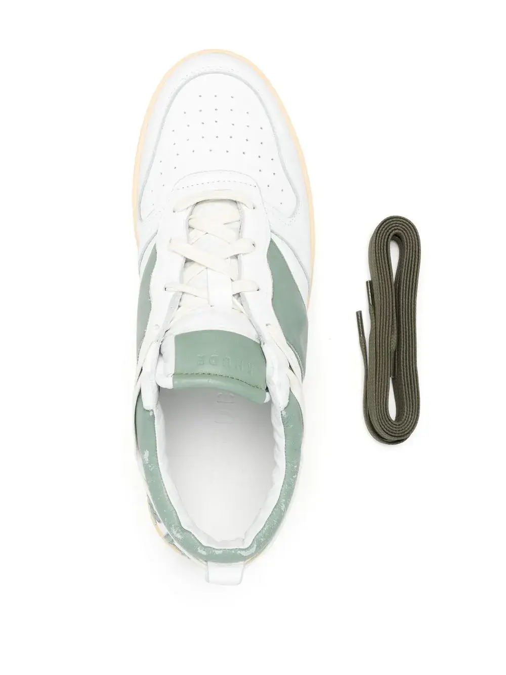Белый, экстракт шалфея, телячья кожа, логотип, нашивка с логотипом на язычке, перфорация, вставки, шнуровка спереди, закругленный носок, плоская резиновая подошва и стелька с логотипом.