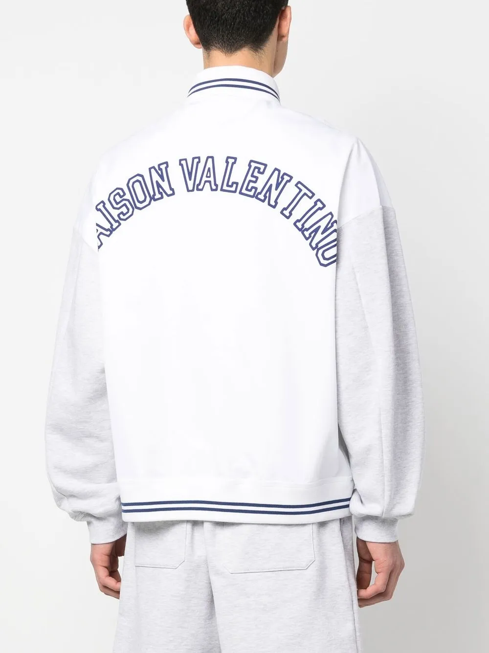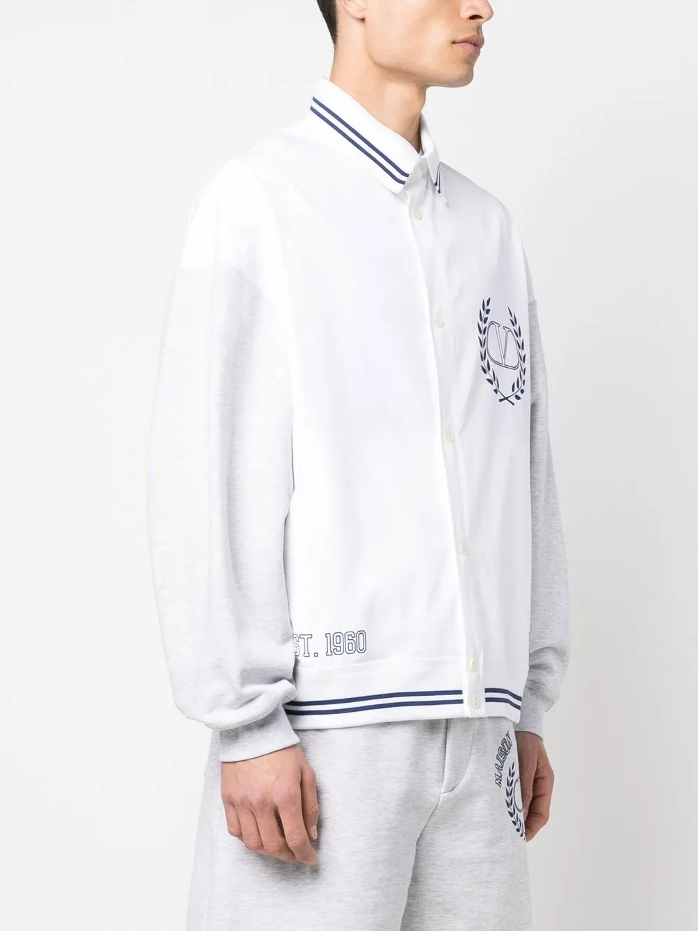 Коллекция Valentino Ready To Wear, белый, темно-синий, светло-серый, хлопок, вставки, декор VLogo Signature, отделка в полоску, принт с логотипом сзади, классический воротник, застежка на пуговицах спереди, длинные рукава, эластичные манжеты и эластичный подол.