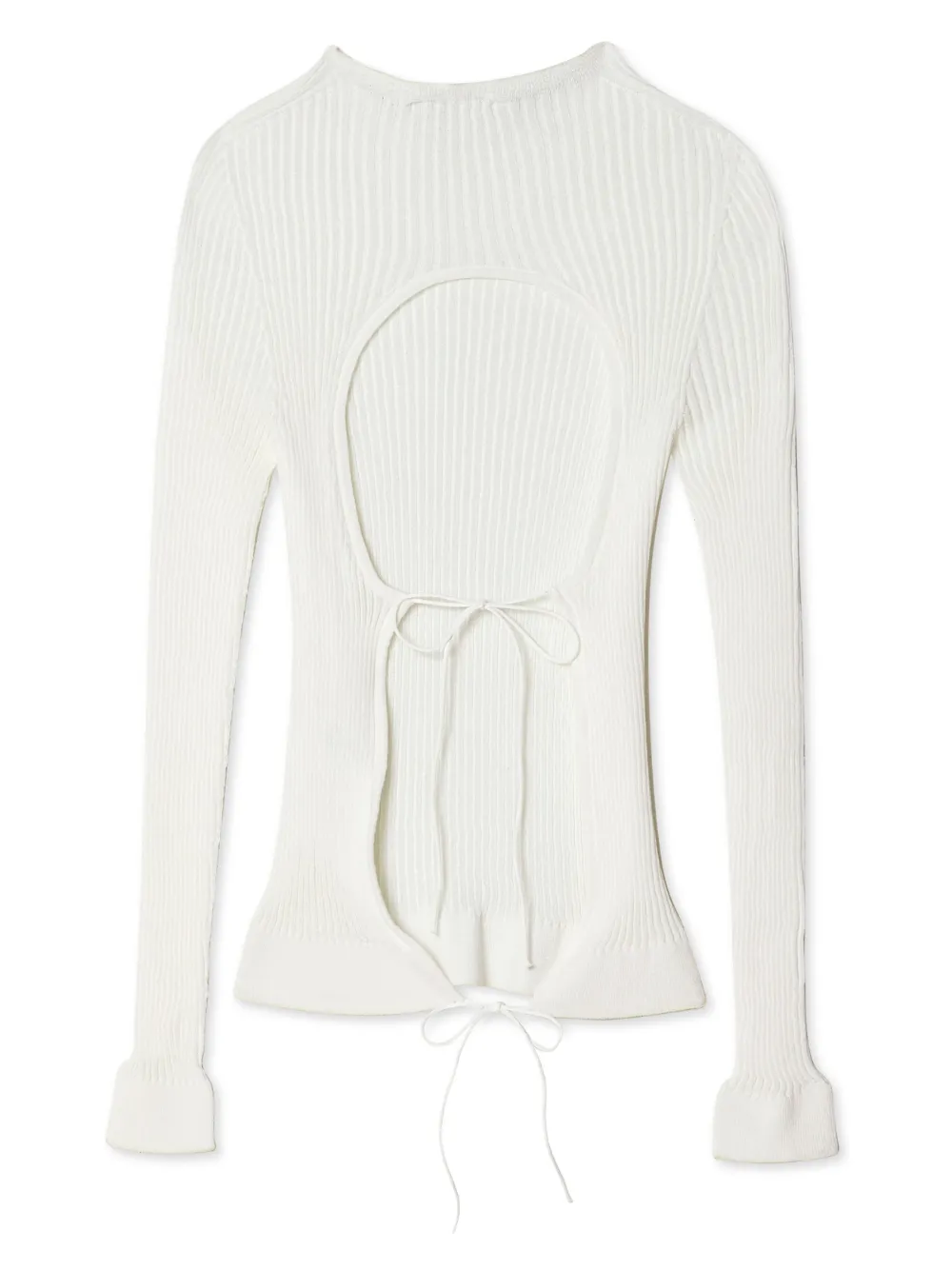 Белый, смесовый хлопок, трикотаж в рубчик, вырезные детали, круглый вырез, застежка на завязке сзади и длинные рукава.